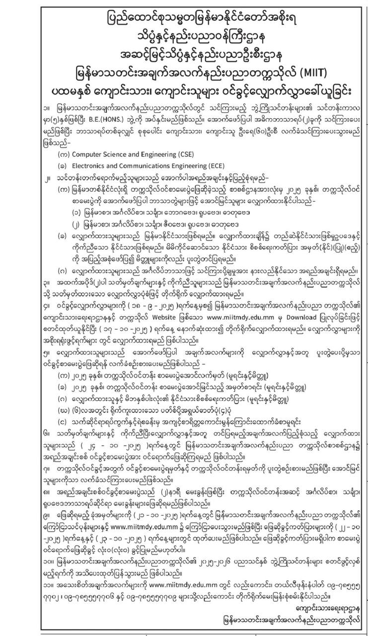မြန်မာသတင်းအချက်အလက် နည်းပညာတက္ကသိုလ် (MIIT)ပထမနှစ် ဝင်ခွင့်လျှောက်လွှာခေါ်ယူခြင်း