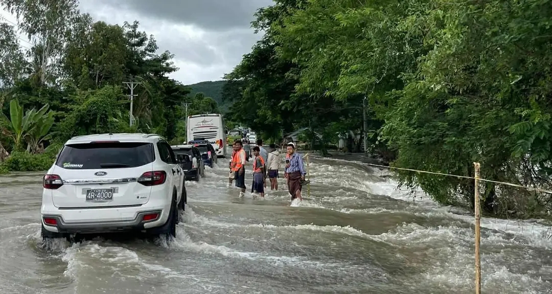 မန္တလေးတိုင်းကြက်မောက်တောင်ဆည်နဲ့ မုန်တိုင်ဆည်ရေလျှံမှုကြောင့် မိတ္ထီလာ - ကျောက်ပန်းတောင်းကားလမ်းပိတ်နေ