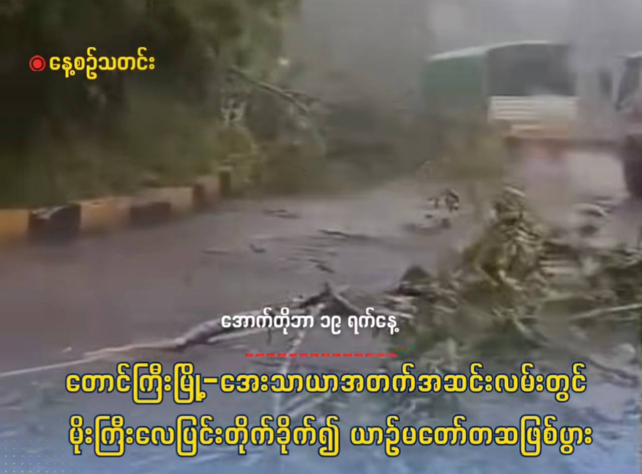 ရှမ်းပြည်နယ် တောင်ပိုင်း၊ တောင်ကြီးမြို့နှင့် အေးသာယာအတက်လမ်းတွင် မိုးကြီးလေပြင်းတိုက်ခိုက်မှုကြောင့် သစ်ပင်ကျိုးမှုကာ လမ်းပိတ်ခဲ့ရပြီး၊ ယာဉ်အတက်အဆင်းတို့အားလုံးကို အဆင်းတစ်လမ်းတည်းသုံးခဲ့ရသဖြင့် ကားများအချိန်ကြာမြင့်စွာ ယာဉ်ကြောပိတ်ဆို့ခဲ့ သည်။ယာဉ်မတော်ဆဖြစ်ပွားမှုကြောင့် ကားများ အချိန်ကြာမြင့်စွာ စောင့်ဆိုင်းခဲ့ရပီး Alphard ကားတစ်စီးသည်လည်း လမ်းဘေးသို့မောင်းဝင်ရာမှ ဘီးတစ်ဘီး ကျွံသွားခဲ့ကြောင်းသိရသည်။တောင်ကြီးအတက်လမ်းတွင် သစ်ပင်ကျိုးကျမှု သုံးနေရာခန့် ဖြစ်ပွားခဲ့ကြောင်း သိရသည်။