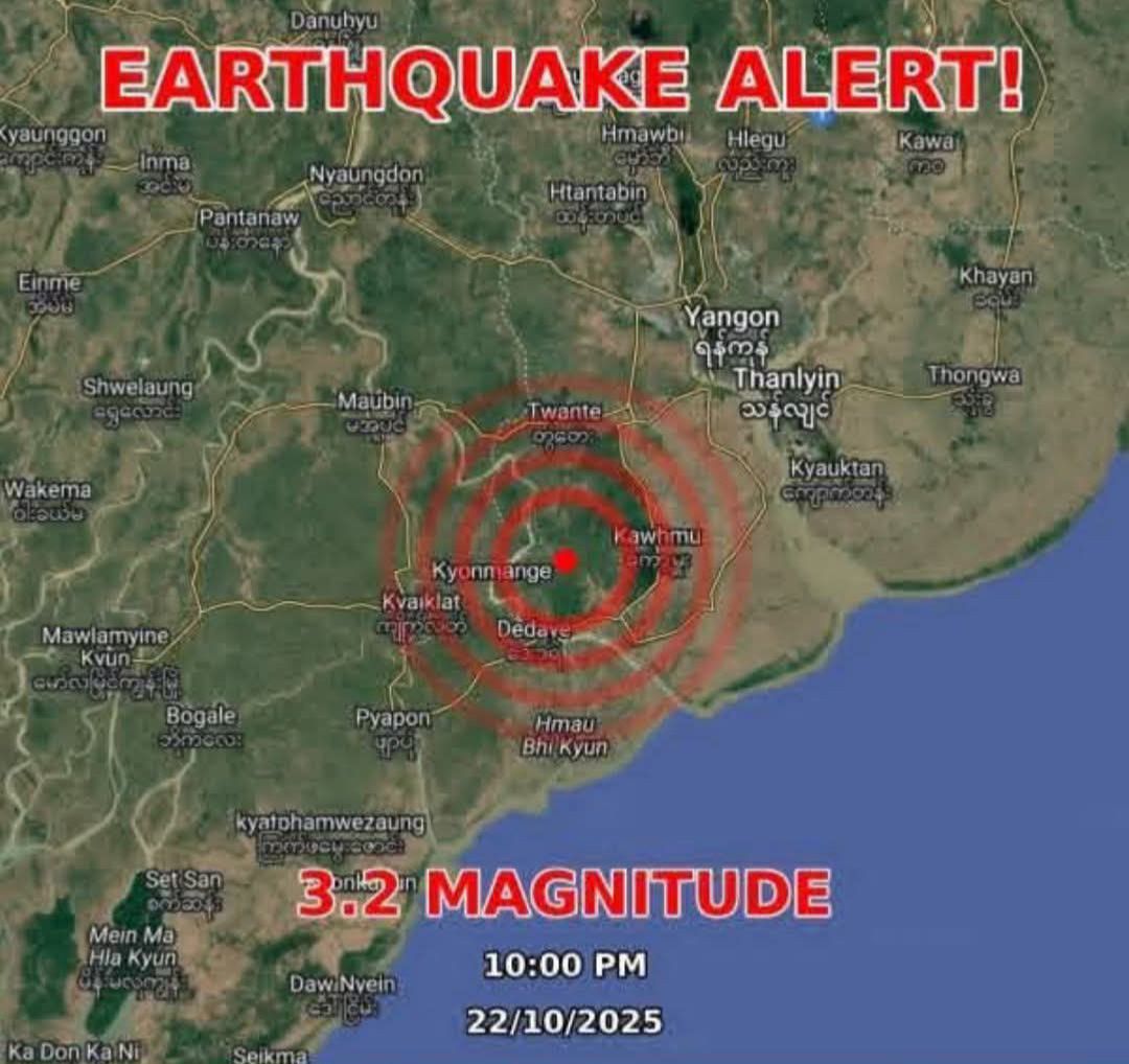 ရန်ကုန်တိုင်း၊ကွမ်းခြံကုန်းမြို့ကို ဗဟိုပြု၍ အင်အား ၃.၂အဆင့် ငလျင်လှုပ်ခတ်ခဲ့