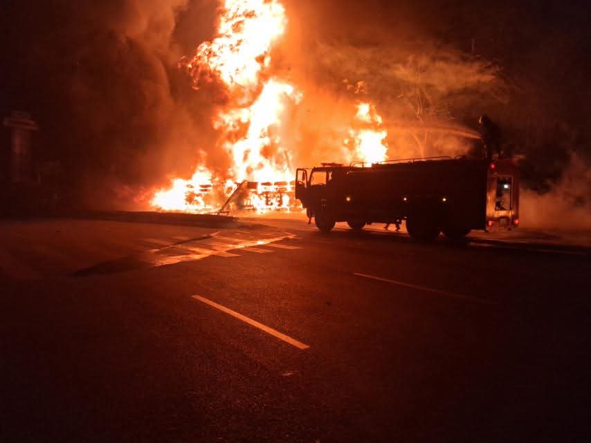 ၁၀.၁၂.၂၀၂၅ ရက်နေ့၊ ၂၂ နာရီ၁၇မိနစ် အချိန်ခန့်၊ ရန်ကုန်တိုင်းဒေသကြီး၊ မင်္ဂလာဒုံမြို့နယ်၊ မြောက်ပိုင်းရပ်ကွက်၊ ဘုရားလေးလမ်းကွေ့တွင် ဆီဘောက်ဆာယာဉ်(၁)စီးသည် ရပ်ထားသောယာဉ်(၁)စီးအား ဝင်တိုက်မှုဖြစ်ပွားပြီး မီးလောင်နေကြောင်း သတင်းရရှိသဖြင့် မင်္ဂလာဒုံမြို့နယ်မီးသတ်စခန်းမှ မီးငြှိမ်းသတ်ယာဉ်(၂)စီး၊ မီးသတ်ရေသယ်ယာဉ်(၁)စီး၊ မှော်ဘီမြို့နယ်မီးသတ်စခန်းမှ မီးငြှိမ်းသတ်ယာဉ်(၁)စီး၊ မီးသတ်ရေသယ်ယာဉ်(၁)စီး၊ အင်းစိန်ခရိုင်မီးသတ်စခန်းမှ မီးငြှိမ်းသတ်ယာဉ်(၁)စီး၊ မီးသတ်ရေသယ်ယာဉ်(၁)စီး၊ LUF-60 ယာဉ်(၁)စီး၊ ပုလဲအရန်မီးသတ်စခန်းမှ မီးငြှိမ်းသတ်ယာဉ်(၂)စီး၊ မီးသတ်ရေသယ်ယာဉ်(၂)စီး၊ သန္ဓေမီးသတ်တပ်ဖွဲ့ဝင်များ၊ အရန်မီးသတ်တပ်ဖွဲ့ဝင်များဖြင့် ထွက်ခွာငြှိမ်းသတ်လျက်ရှိပါသည်။ Update