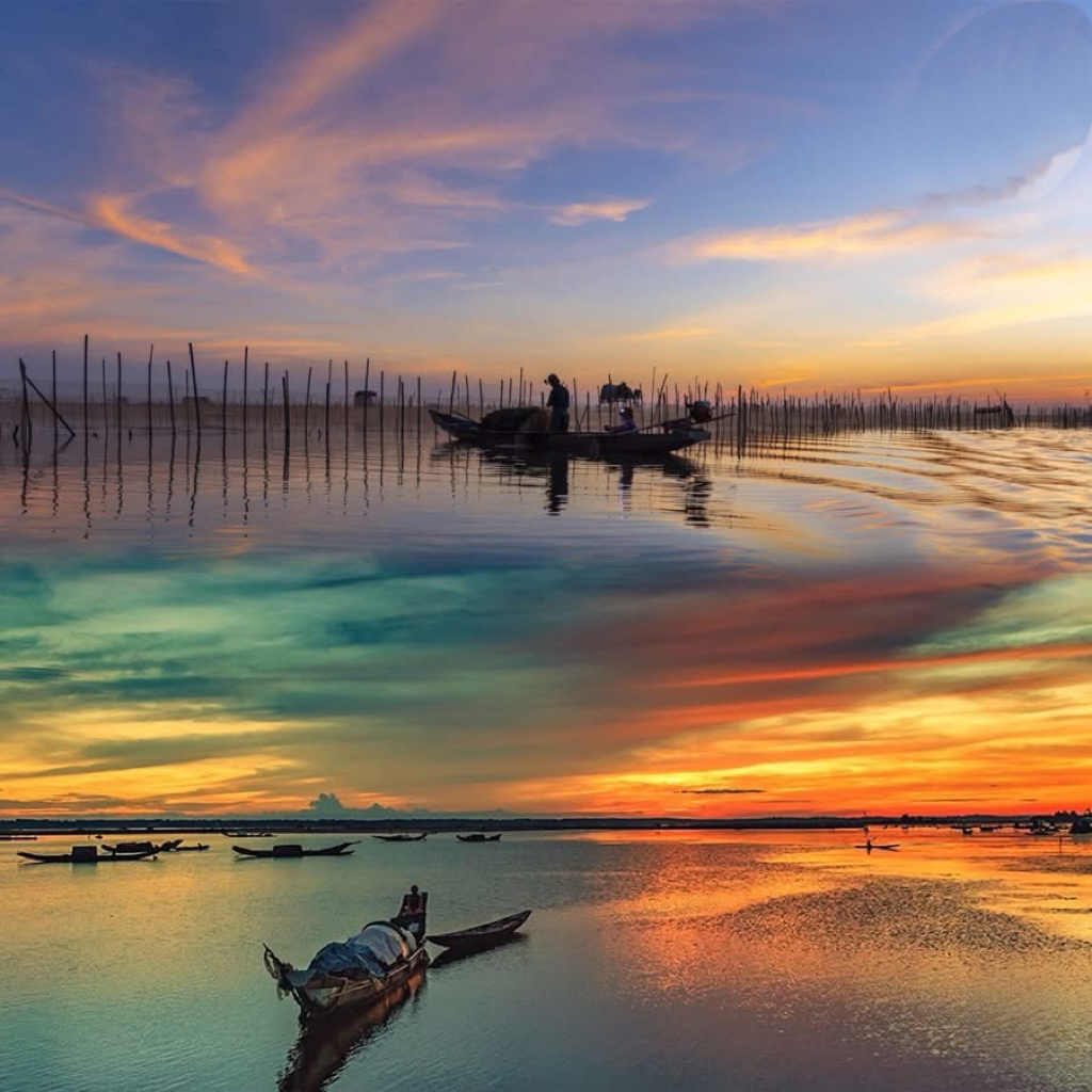 မြစ်များနှင့် ပင်လယ်ကြားတွင် တည်ရှိသော တမ်ဂျန်း ရေအိုင်သည် ဟူးမြို့တွင် နေဝင်ချိန်ကို ကြည့်ရှုရန် အလှဆုံးနေရာများထဲမှ တစ်ခုဖြစ်သည်။ နေရောင်မှေးမှိန်သွားချိန်တွင် ကျယ်ပြန့်သော ရေပြင်သည် ရွှေရောင်ပြောင်းသွားပြီး အိမ်ပြန်လာသော ငါးဖမ်းလှေငယ်လေးများဖြင့် မှတ်သားထားသည်။ လေထုသည် ငြိမ်သက်လာပြီး၊ အရောင်များသည် ပယင်းရောင်မှ ခရမ်းရောင်သို့ ပြောင်းလဲသွားကာ အချိန်သည် နှေးကွေးသွားသကဲ့သို့ ခံစားရစေသည်။ ဤသည်မှာ နေ့တစ်နေ့၏အဆုံးတွင် ဟူးမြို့၏အလှကို အေးချမ်းစွာ ဖော်ပြနေသော ရိုးရှင်းပြီး ကဗျာဆန်သည့် မြင်ကွင်းတစ်ခုပင် ဖြစ်သည်။
