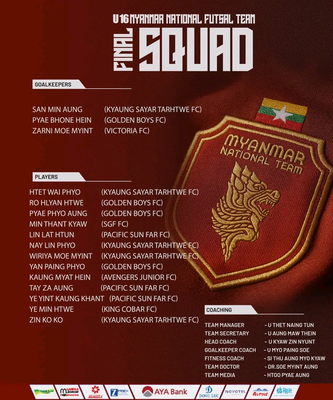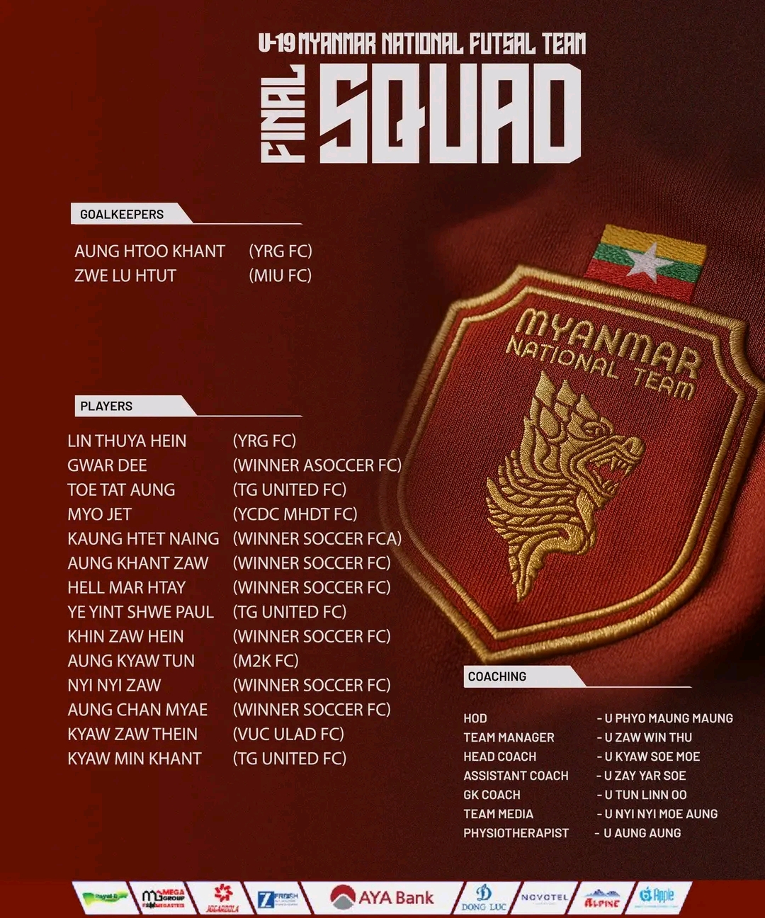 ASEAN U16 FUTSAL CHAMPIONSHIP 2025 ပွဲစဉ်တွေကိုလည်း ဒီဇင်ဘာလ(၂၃)ရက် INDOSIA VS MYANMAR ဒီဇင်ဘာလ(၂၄)ရက် MYANMAR VS THAILAND ဒီဇင်ဘာလ(၂၅)VIETNAM VS MYANMAR နဲ့ ဒီဇင်ဘာလ(၂၆)ရက်မှာ MYANMAR VS BRUNIE စတဲ့