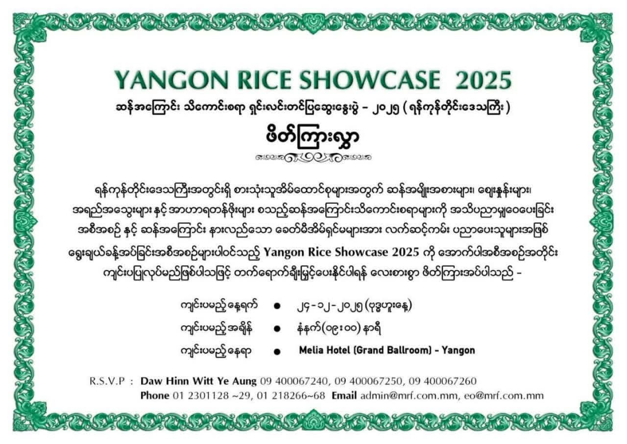 မြန်မာနိုင်ငံဆန်စပါးအသင်းချုပ် (MRF) သည် ရန်ကုန်တိုင်းဒေသကြီးအစိုးရနှင့် စားသုံးသူရေးရာဦးစီးဌာနတို့ ပူးပေါင်း၍ ဒီဇင်ဘာ ၁၆ ရက်နေ့တွင် ရန်ကုန်မြို့ Melia Hotel ၌ ဆန်အကြောင်းသိကောင်းစရာပြပွဲ ၂၀၂၅ (Yangon Rice Showcase-2025) ကို စီစဉ်ကျင်းပမည်ဖြစ်သည်။ ဤပွဲ၏ ရည်ရွယ်ချက်မှာ ဆန်အမျိုးအစား၊ အရည်အသွေး၊ ဈေးနှုန်း၊ အာဟာရတန်ဖိုးနှင့် ချက်ပြုတ်နည်းများဆိုင်ရာ အသိပညာများကို မျိုးဆက်သစ်စားသုံးသူများနှင့် အိမ်ရှင်မများထံ မျှဝေပေးရန်နှင့် စားသုံးသူများ ပစ္စည်းမှန်၊ ဈေးနှုန်းမှန်၊ အရည်အသွေးမှန် ရွေးချယ်နိုင်ရန်ဖြစ်သည်။ ထို့အပြင် ရွေးချယ်ခံရသည့် အိမ်ရှင်မများအား ဆန်အကြောင်းသိကောင်းစရာများကို လက်ဆင့်ကမ်းမျှဝေပေးမည့် Rice Ambassador များအဖြစ် ခန့်အပ်တာဝန်ပေးသွားမည်ဖြစ်ကြောင်း သိရသည်။