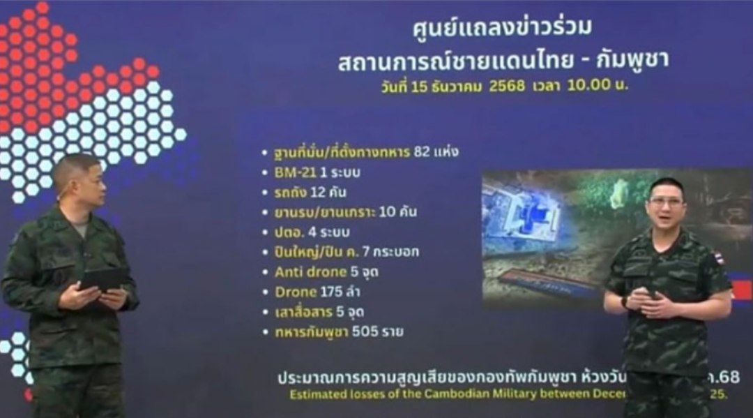 ထိုင်း-ကမ္ဘောဒီးယား နယ်စပ်အငြင်းပွားမှု တိုက်ပွဲ ၈ ရက်မြောက်နေ့မှာ ကမ္ဘောဒီးယားဘက်က စစ်သား ၅၀၅ ယောက် ကျဆုံးခဲ့ကြောင်း ထိုင်းတပ်မတော် (ကြည်းတပ်) ရဲ့ ထုတ်ပြန်ချက်ကို ကိုးကားပြီး ထိုင်းသတင်းတွေမှာ ဖော်ပြပါတယ်။ ဒီဇင်ဘာ ၈ ရက်မှ ၁၅ ရက်ထိ ၈ ရက်တာ တိုက်ပွဲတွေအတွင်း ကမ္ဘောဒီးယားစစ်တပ် ခြေကုပ်စခန်းပေါင်း ၈၂ နေရာကို တိုက်ခိုက်သိမ်းပိုက်ခဲ့ပြီး ကမ္ဘောဒီးယားစစ်သည် ၅၀၅ ယောက် ကျဆုံးသွားကြောင်း ထိုင်းတပ်မတော် (ကြည်းတပ်) ဒုတိယ ပြောရေး ဆိုခွင့်ရှိသူ ဗိုလ်မှုးကြီး ရစ်ချား ဆုခ်ဆုဝါနွန်းက ဒီဇင်ဘာ ၁၅ ရက် ညနေပိုင်းသတင်းစာရှင်းပွဲမှာ ပြောပါတယ်။တိုက်ပွဲအတွင်း ကမ္ဘောဒီးယားစစ်တပ်ရဲ့ BM-21 ဒုံးကျည်တခု၊ တင့်ကား ၁၂ စီး၊ စစ်လက်နက်တင်ကား ၁၀ စီး၊ တာဝေးပစ်လက်နက်ကြီး ၇ လက်၊ ဒရုန်းဖျက်ကရိယာ ၅ ခု၊ ဒရုန်း ၁၇၅ စင်းတို့ကို သိမ်းဆည်းရမိပြီး ဆက်သွယ်ရေးဧရိယာတိုင် ၅ တိုင်ကို ဖျက်ဆီးနိုင်ခဲ့တယ်လို့ ဆိုပါတယ်။
