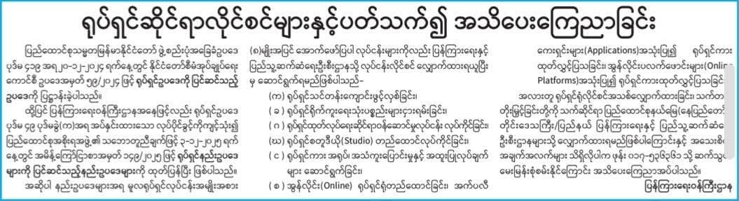 ၊(၅)ရုပ်ရှင်အရုပ်အသံကူးပြောင်းခြင်းနှင့်အထူးပြုလုပ်ချက်များ၊(၆)ရုပ်ရှင်အွန်လိုင်းရုပ်ရှင်ရုံ၊ရုပ်ရှင်Applicationနဲ့ရုပ်ရှင်ပြခြင်း၊အွန်လိုင်းပလက်ဖောင်းမှ ရုပ်ရှင်ပြသတာတွေဆောင်ရွက်ပါက ပြန်ကြားရေးဝန်ကြီးဌာနမှာ လိုင်စင်လျှောက်ထားရမှာဖြစ်တယ်လို့ သိရပါတယ်။
