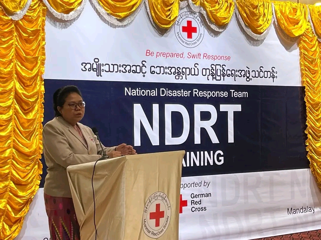 မြန်မာနိုင်ငံကြက်ခြေနီအသင်းနှင့် ဂျာမနီနိုင်ငံကြက်ခြေနီအသင်းတို့ ပူးပေါင်းဆောင်ရွက်သော အမျိုးသားအသင်း အဆင့်ဘေးအန္တရာယ်တုံ့ပြန်ရေးအဖွဲ့သင်တန်း (National Disaster Response Team Training) (NDRT) ဖွင့်ပွဲကို ဒီဇင်ဘာလ(၁၆)ရက်နေ့ နံနက်ပိုင်းက မန္တလေးတိုင်းဒေသကြီး အမရပူရမြို့နယ်တွင် ပြုလုပ်ခဲ့ရာ သင်တန်းဖွင့်ပွဲသို့ မန္တလေးတိုင်းဒေသကြီးအစိုးရအဖွဲ့မှ တာ၀န်ရှိသူများ၊ မန္တလေးတိုင်းဒေသကြီး ကြက်ခြေနီ ကြီးကြပ်မှုကော်မတီမှ တာ၀န်ရှိသူများ၊ စစ်ကိုင်းတိုင်းဒေသကြီးနှင့် မွန်ပြည်နယ်တို့မှ ကြက်ခြေနီ တပ်ဖွဲ့မှူးများ၊ မွန်ပြည်နယ်ဒုတိယကြက်ခြေနီတပ်ဖွဲ့မှူး၊ တိုင်းဒေသကြီး/မြို့နယ်အဆင့် ဌာနဆိုင်ရာ တာ၀န်ရှိသူများ၊ သင်တန်းနည်းပြများ၊ သင်တန်းသား/သူများ တက်ရောက်ခဲ့ပါသည်။သဘာ၀ဘေးအန္တရာယ်ကြုံတွေ့ချိန်တွင် လျင်မြန်စွာ တုံ့ပြန်ဆောင်ရွက်နိုင်ရန် ရည်ရွယ်ပြီး ဒီဇင်ဘာလ(၁၆)ရက်နေ့မှ (၂၂)ရက်နေ့အထိ (၅)ရက်တာ ပြုလုပ်နေသည့် အဆိုပါသင်တန်းသို့ ကြက်ခြေနီ၀န်ထမ်းများ၊ တိုင်းဒေသကြီး/ပြည်နယ်အသီးသီးမှ ကြက်ခြေနီစေတနာလုပ်အားရှင်များ၊ မိတ်ဖက် ကြက်ခြေနီအသင်းများမှ ၀န်ထမ်းများ စုစုပေါင်း သင်တန်းသား/သူ (၂၆)ဦး တက်ရောက်လျက် ရှိပါသည်။