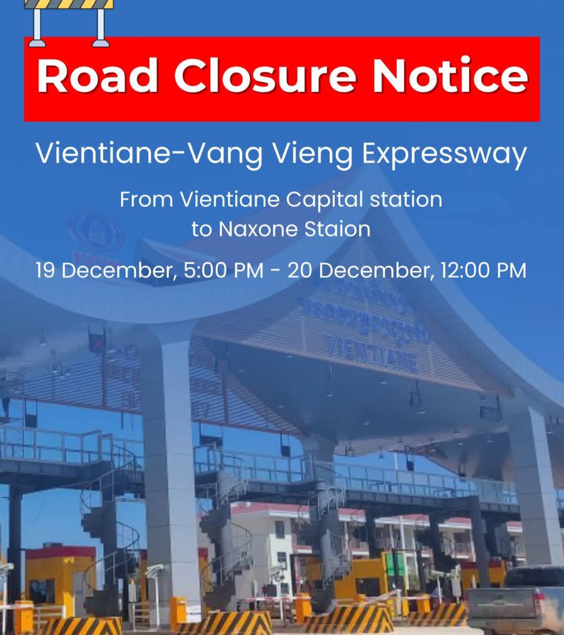 လာအိုနိုင်ငံရှိ ဗီယန်ကျန်း-ဗန်ဗီယန်း အမြန်လမ်းမကြီး၏ ပထမဆုံး ၁၀ ကီလိုမီတာ အပိုင်းအား လမ်းဖွင့်လှစ်ခြင်း ၅ နှစ်ပြည့် အထိမ်းအမှတ်အဖြစ် မီနီမာရသွန်ပွဲတော် ကျင်းပပြုလုပ်မည်ဖြစ်၍ ဒီဇင်ဘာ ၁၉ ရက် ညနေ ၅ နာရီမှ ဒီဇင်ဘာ ၂၀ ရက် နေ့လယ် ၁၂ နာရီအထိ ယာယီပိတ်သိမ်းသွားမည်ဖြစ်သည်။ ဗီယန်ကျန်းမြို့တော်ဘူတာနှင့် နာခွန်စခန်းကြား နာဆေထောင်ခရိုင်အတွင်းရှိ ဤလမ်းပိုင်းကို ပိတ်ထားချိန်အတွင်း ဗန်ဗီယန်းဘက်သို့ သွားလာမည့် ယာဉ်မောင်းများအနေဖြင့် နာခွန်စခန်းမှသာ အမြန်လမ်းသို့ ဝင်/ထွက်သွားလာနိုင်မည်ဖြစ်ကြောင်း သိရသည်။