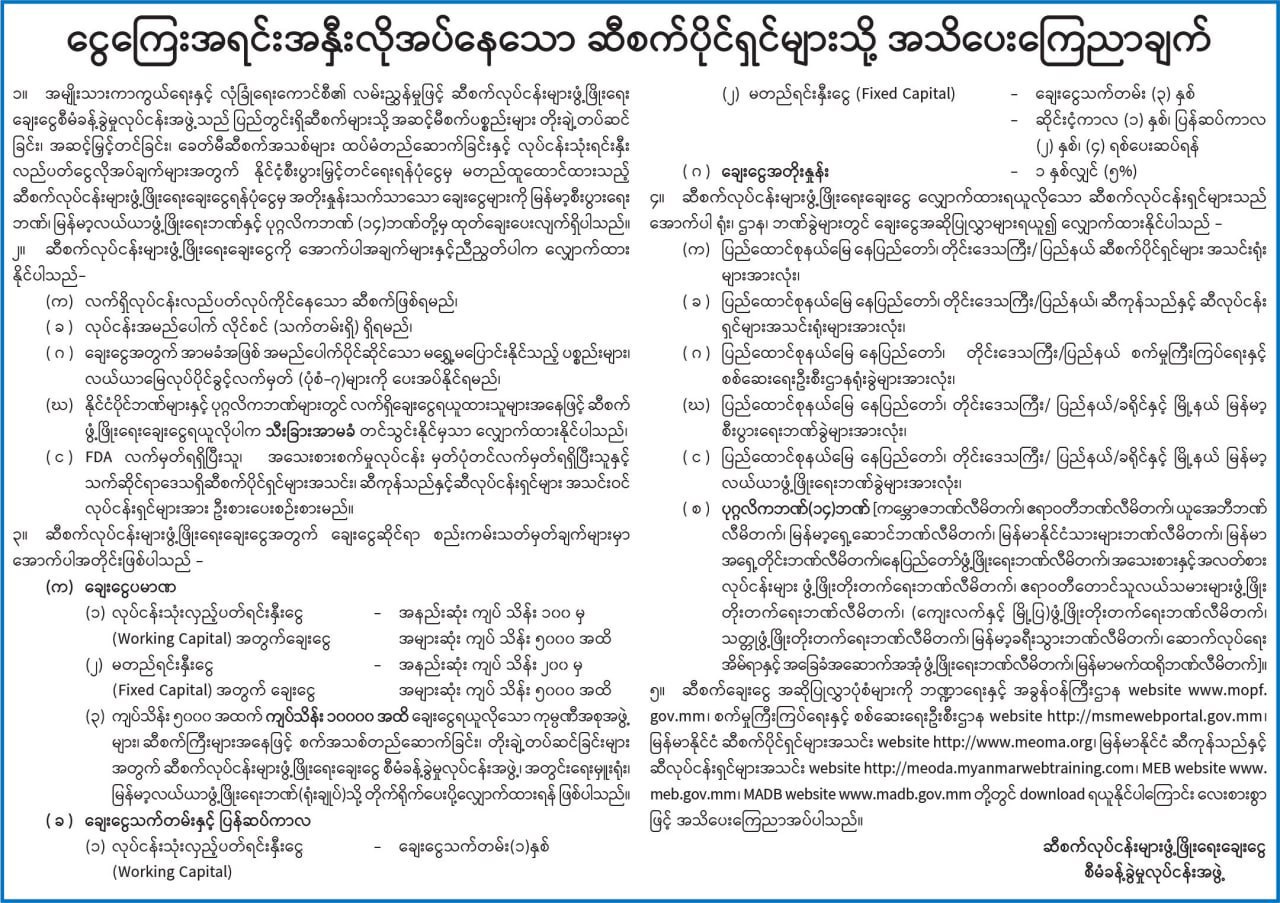 ပြည်တွင်း၌ ဆီစက်လုပ်ငန်းများဖွံ့ဖြိုးရေး ချေးငွေစီမံခန့်ခွဲမှုလုပ်ငန်းအဖွဲ့သည် ပြည်တွင်းရှိဆီစက်များသို့ အဆင့်မီစက်ပစ္စည်းများ တိုးချဲ့တပ်ဆင်ခြင်း၊ အဆင့်မြှင့်တင်ခြင်း၊ ခေတ်မီဆီစက်အသစ်များ ထပ်မံတည်ဆောက်ခြင်းနှင့် လုပ်ငန်းသုံးရင်းနှီး လည်ပတ်ငွေ လိုအပ်ချက်များအတွက် နိုင်ငံ့စီးပွားမြှင့်တင်ရေးရန်ပုံငွေမှ မတည်ထူထောင်ထားသည့် ဆီစက်လုပ်ငန်းများ ဖွံ့ဖြိုးရေးချေးငွေရန်ပုံငွေမှ အတိုးနှုန်းသက်သာသော ချေးငွေများကို မြန်မာ့စီးပွားရေး ဘဏ်၊ မြန်မာ့လယ်ယာဖွံ့ဖြိုးရေးဘဏ်နှင့် ပုဂ္ဂလိကဘဏ် (၁၄) ဘဏ်တို့မှ ထုတ်ချေးပေးလျက်ရှိသည်။ကျပ်သိန်း ၁၀,၀၀၀ အထိ ချေးယူလိုပါက ဆီစက်လုပ်ငန်းများဖွံ့ဖြိုးရေးချေးငွေ စီမံခန့်ခွဲမှုလုပ်ငန်းအဖွဲ့၊ အတွင်းရေးမှူးရုံး၊ မြန်မာ့လယ်ယာဖွံ့ဖြိုးရေးဘဏ် (ရုံးချုပ်) သို့ တို-က်ရို-က်လျှောက်ထားနိုင်ကြောင်းသိရသည်။