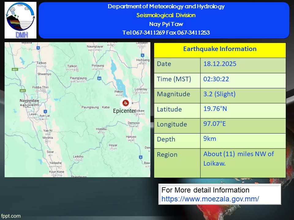 ကယားပြည်နယ်၊လွိုင်ကော်မြို့တွင် ယနေ့ ဒီဇင်ဘာလ ၁၈ ရက်နေ့၊ မြန်မာစံတော်ချိန် (၀၂)နာရီ၊ (၃၀)မိနစ်၊ (၂၂) စက္ကန့် အချိန်တွင် ငလျင်လှုပ်ခတ်သွားပါသည်။ မြန်မာနိုင်ငံ ပြည်တွင်း (လွိုင်ကော်မြို့၏ အနောက်မြောက်ဘက် (၁၁) မိုင်ခန့်အကွာ) မြောက်လတ္တီတွဒ် (၁၉.၇၆) ဒီဂရီ၊ အရှေ့လောင်ဂျီတွဒ် (၉၇.၀၇) ဒီဂရီ၊ အနက် (၉) ကီလိုမီတာကို ဗဟိုပြုပြီး အင်အား ၃.၂အဆင့် ငလျင် လှုပ်ခတ်ခဲ့တာဖြစ်ပါသည်။