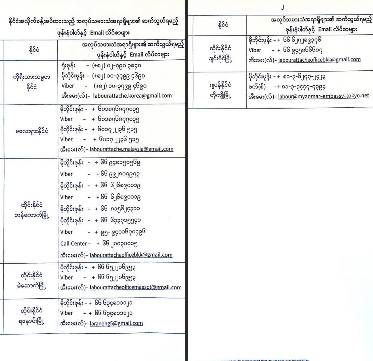 တောင်ကိုရီးယား၊ မလေးရှား၊ ထိုင်းနှင့် ဂျပန်နိုင်ငံတို့တွင် အလုပ်လုပ်ကိုင်နေသော မြန်မာအလုပ်သမားများအနေဖြင့် အခက်အခဲ တစ်စုံတစ်ရာရှိပါက သက်ဆိုင်ရာ နိုင်ငံအလိုက် အကူအညီတောင်းခံနိုင်သည့် အလုပ်သမားသံအရာရှိများ၏ ဖုန်းနံပါတ်များနှင့်အီးမေးလ်လိပ်စာများကို အလုပ်သမားညွှန်ကြားမှုဦးစီးဌာနမှ ထုတ်ပြန်ထားသည်။