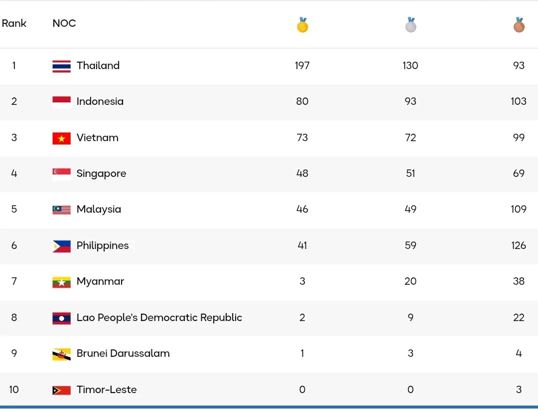 (၃၃)ကြိမ်မြောက် အရှေ့တောင်အာရှအားကစားပြိုင်ပွဲ၏ ဒီဇင်ဘာလ(၁၈)ရက်နေ့ ယှဉ်ပြိုင်မှုများ ပြီးဆုံးသွားချိန်တွင် မြန်မာအားကစားအဖွဲ့က ရွှေ(၃)ခု၊ ငွေ(၂၀)ခု၊ ကြေး(၃၈)ခုဖြင့် နိုင်ငံအလိုက် အဆင့်(၇)တွင် ရပ်တည်နေသည်။ အိမ်ရှင်ထိုင်းနိုင်ငံမှာ ရွှေတံဆိပ်(၁၉၇)ခုဖြင့် ဆုတံဆိပ်ဇယားကို ဦးဆောင်နေပြီး အင်ဒိုနီးရှားက ဒုတိယနှင့် ဗီယက်နမ်က တတိယနေရာတွင် အသီးသီးရပ်တည်နေကြသည်။ မြန်မာအားကစားအဖွဲ့အတွက် ဆုတံဆိပ်များကို-ပိုက််ကျော်ခြင်း+ခြင်းလုံး+ကွင်းသွင်းခြင်းခတ်မှ ရွှေ(၂)ခု၊ ငွေ(၃)ခု၊ ကြေး(၄)ခု၊ဘိလိယက်နှင့်စနူကာမှ ရွှေ(၁)ခု၊ ငွေ(၁)ခု၊ ကြေး(၃)ခု၊ဝူရှူးမှ ငွေ(၃)ခု၊ ကြေး(၂)ခု၊ကနူး+ရိုးရာလှေမှ ငွေ(၃)ခု၊ ကြေး(၄)ခု၊