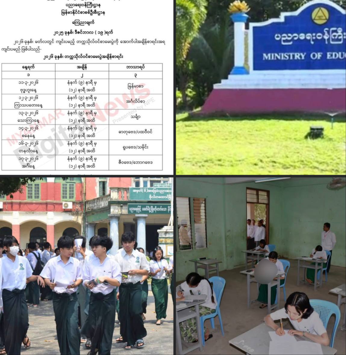 တက္ကသိုလ်ဝင်စာမေးပွဲကို လာမဲ့ ၂၀၂၆ ခုနှစ် မတ်လ ၁၁ ရက်ကနေ ၁၇ ရက်ထိ ကျင်းပ သွားမယ်လို့ ပညာရေးဝန်ကြီးဌာနက ဒီဇင်ဘာ ၁၉ ရက်မှာ ကြေညာချက် ထုတ်ပြန်ပါတယ်။အဲဒီ ကြေညာချက်အရ မတ် ၁၁ ရက်မှာ မြန်မာစာ၊ မတ် ၁၂ ရက်မှာ အင်္ဂလိပ်စာ၊ မတ် ၁၃ ရက်မှာ သင်္ချာ၊ မတ် ၁၄ ရက်မှာ ဓာတုဗေဒ/ပထဝီဝင်၊ မတ် ၁၆ ရက်မှာ ရူပဗေဒ/သမိုင်း နဲ့ မတ် ၁၇ ရက်မှာ ဇီဝဗေဒ/ဘောဂဗေဒ ဘာသာရပ်တွေကို ဖြေဆိုရမှာ ဖြစ်ပါတယ်။