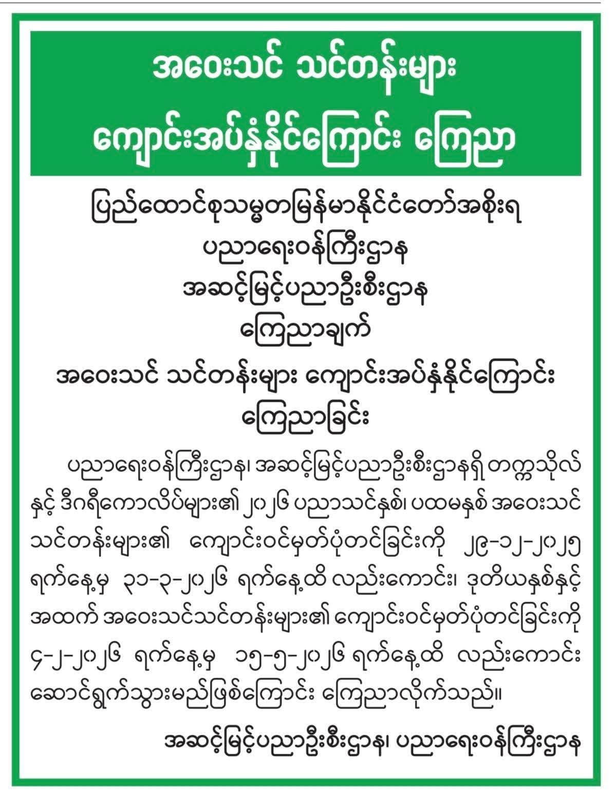 ၂၀၂၆ ပညာသင်နှစ်အတွက် တက္ကသိုလ်နှင့် ဒီဂရီကောလိပ်များ၏ အဝေးသင်သင်တန်းများ ကျောင်းအပ်နှံခြင်းကို ပထမနှစ် ကျောင်းသား၊ ကျောင်းသူများအတွက် ၂၀၂၅ ခုနှစ်၊ ဒီဇင်ဘာလ ၂၉ ရက်မှ ၂၀၂၆ ခုနှစ်၊ မတ်လ ၃၁ ရက်အထိ လည်းကောင်း၊ ဒုတိယနှစ်နှင့်အထက် ကျောင်းသား၊ ကျောင်းသူများအတွက် ၂၀၂၆ ခုနှစ်၊ ဖေဖော်ဝါရီလ ၄ ရက်မှ မေလ ၁၅ ရက်အထိ လည်းကောင်း သတ်မှတ်ထားကြောင်း သိရသည်။ အဝေးသင်တက္ကသိုလ် တက်ရောက်မည့်သူများအနေဖြင့် မိမိတို့ဖြေဆိုရမည့် နှစ်အလိုက် သတ်မှတ်ထားသောရက်များအတွင်း အချိန်မီ ကျောင်းအပ်နှံနိုင်ရန် ပညာရေးဝန်ကြီးဌာနက နှိုးဆော်ထားသည်။