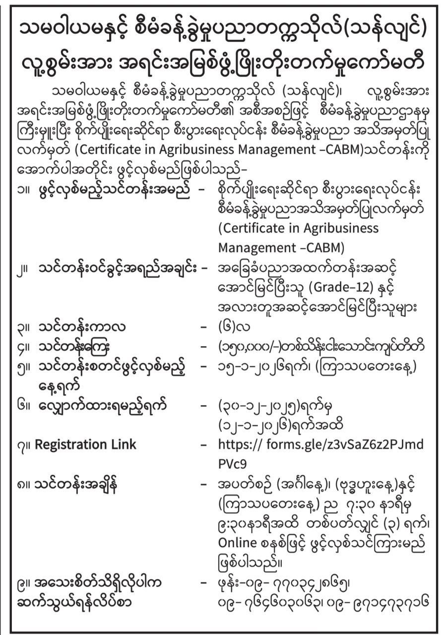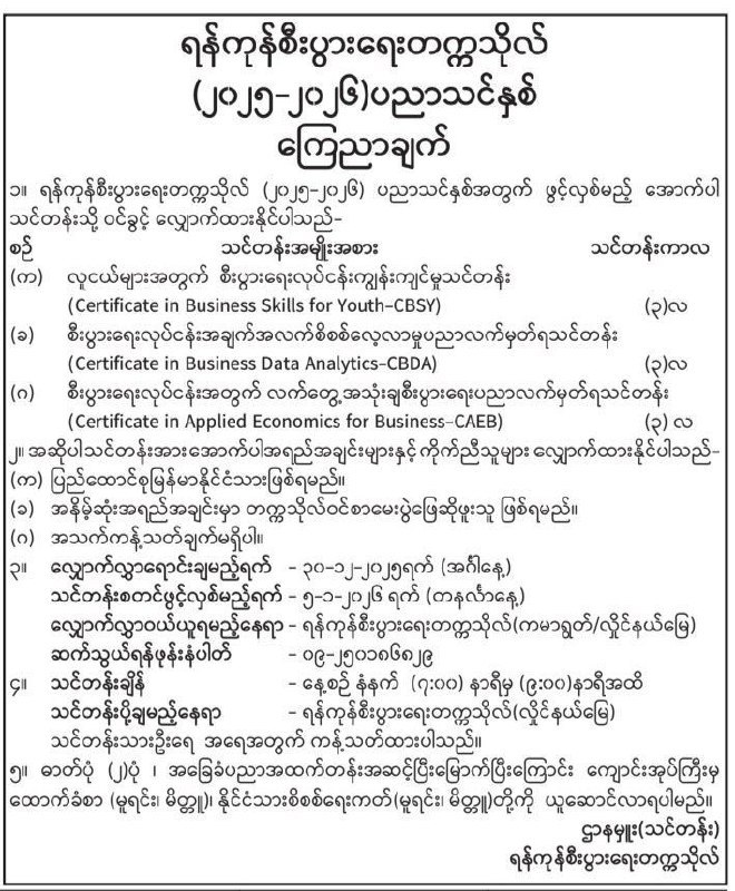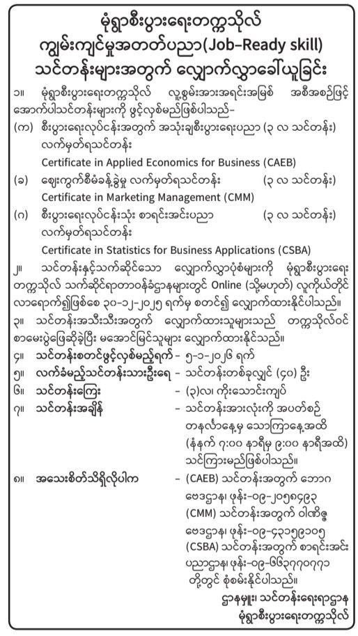 ဆပ်ပြာအမျိုးမျိုးပြုလုပ်နည်း အခြေခံသင်တန်း၊ ဇီဝမြေ ဩဇာအမျိုးမျိုးပြုလုပ်နည်း အခြေခံသင်တန်း၊ ဒေသတွင်းခရီးသွားလုပ်ငန်း အထောက်အကူပြု အင်္ဂလိပ်စကားပြောအခြေခံသင်တန်း၊ စီးပွားရေးလုပ်ငန်းအတွက် အသုံးချစီး ပွားရေးပညာ၊ ဈေးကွက်စီမံခန့်ခွဲမှု လက်မှတ်ရသင်တန်း၊ စီးပွားရေးလုပ်ငန်းသုံးစာရင်းအင်းပညာလက်မှတ်ရသင်တန်း၊ ဆိုလာစွမ်းအင်သုံးလျှပ်စစ်မီးတပ်ဆင်မှုကျွမ်းကျင်မှုသင်တန်း၊ အခြေခံလူသုံးကုန်ပစ္စည်းများထုတ်လုပ်မှုနည်းပညာသင်တန်း၊ သောက်ရေသန့်ထုတ်လုပ်ခြင်း အတတ်ပညာသင်တန်း၊ AI အခြေခံကွန်ပျူတာသင်တန်းအစရှိသည်တို့ကို သင်ကြားပေးသွားမည်ဖြစ်ကြောင်း သိရသည်။ပြည်ထောင်စုသမ္မတ မြန်မာနိုင်ငံသားဖြစ်ရမည်ဖြစ်ပြီး အနိမ့်ဆုံး ပညာအရည်အချင်းမှာ တက္ကသိုလ်ဝင်စာမေးပွဲ ဖြေဆိုဖူးသူ/အခြေခံပညာ အထက်တန်းအဆင့်သင်ကြားဖူးသူ၊ ဖြစ်ရမည်ဖြစ်ပြီး အသက်အကန့်အသတ်မရှိကြောင်း သိရသည်။