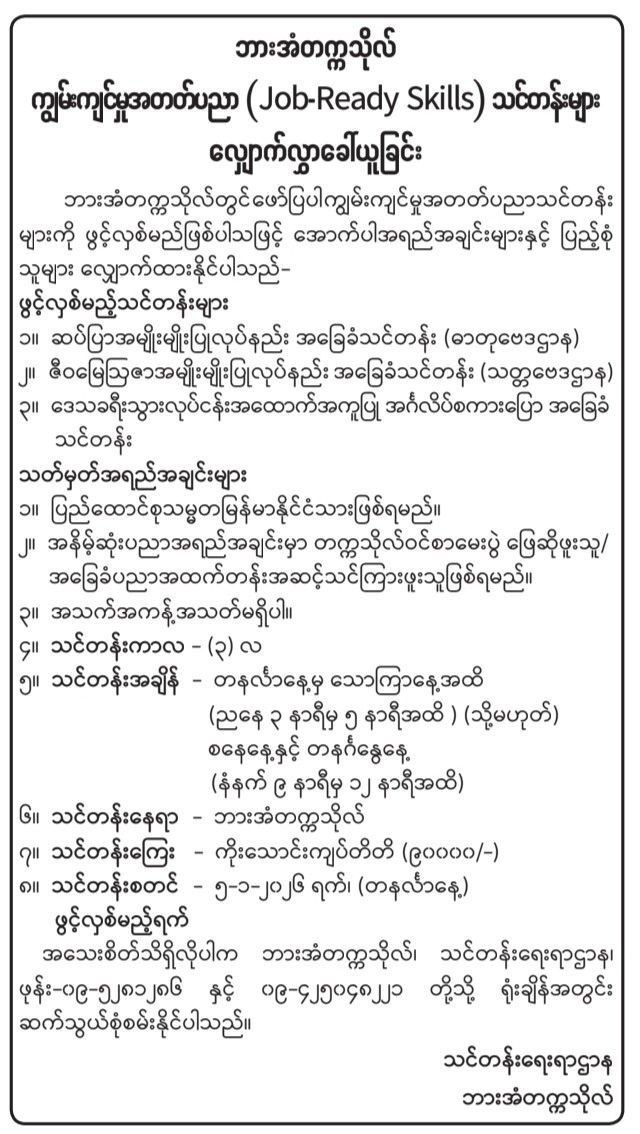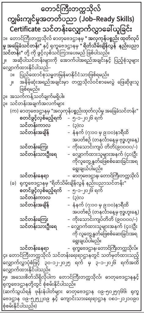 လာမည့်တက္ကသိုလ် (၁၃) ခုမှ ကျွမ်းကျင်မှုအတတ်ပညာ (Job - Ready Skills) သင်တန်းကိုအောက်ပါအတိုင်းဖွင့်လှစ်မည်ဟုထုတ်ပြန်ထားပါတယ်။တက္ကသိုလ် (၁၃) ခုမှ ကျွမ်းကျင်မှုအတတ်ပညာ (Job - Rea dy Skills) သင်တန်းဖွင့်လှစ်မည်