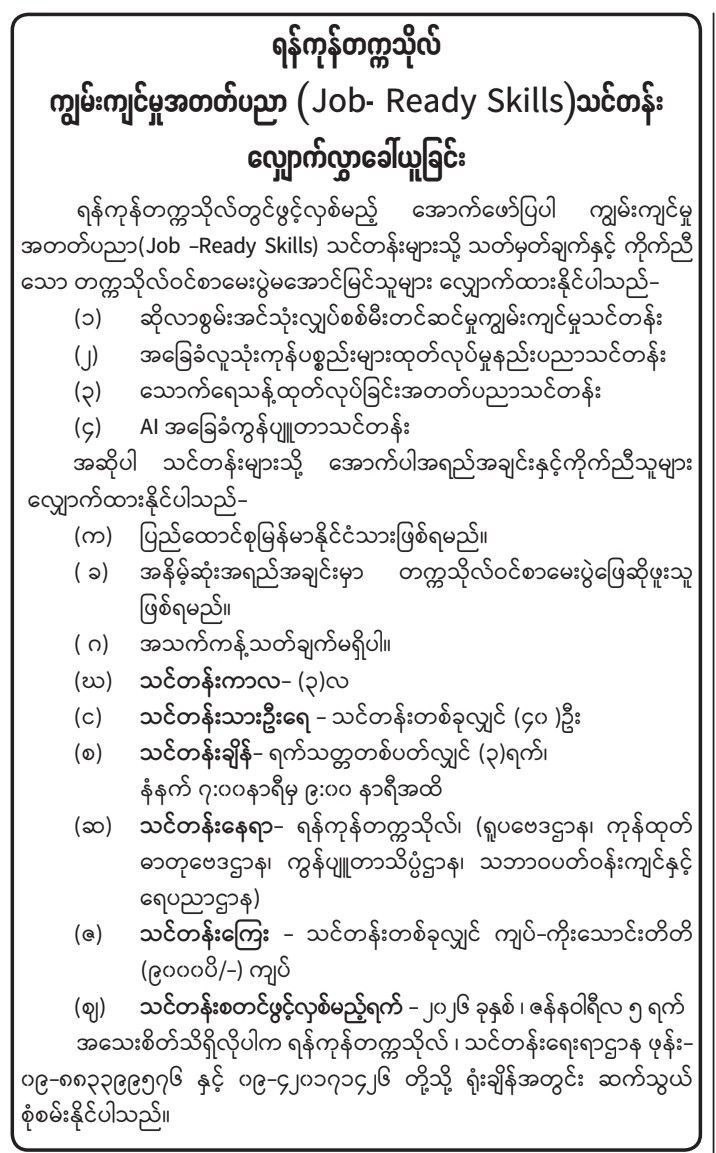 လာမည့်၂၀၂၆-၂၀၂၇ပညာသင်နှစ်အတွက်တက္ကသိုလ် (၁၃) ခုမှ ကျွမ်းကျင်မှုအတတ်ပညာ (Job - Ready Skills) သင်တန်းကိုအောက်ပါအတိုင်းဖွင့်လှစ်မည်ဟုထုတ်ပြန်ထားပါတယ်။လာမည့်တက္ကသိုလ် (၁၃) ခုမှ ကျွမ်းကျင်မှုအတတ်ပညာ (Job - Ready Skills) သင်တန်းဖွင့်လှစ်မည်