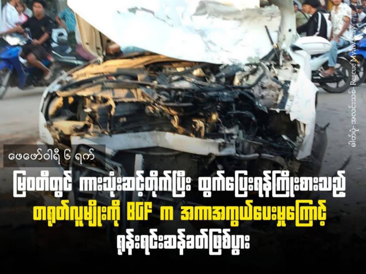 ကရင်ပြည်နယ်၊ မြဝတီမြို့၊ အမှတ် (၅) ရပ်ကွက်တွင် (ဖေဖော်ဝါရီ ၆ ရက်) ညနေပိုင်းက လမ်းပြောင်းပြန်မောင်းနှင်လာသည့် တရုတ်နိုင်ငံသားတစ်ဦး၏ AUDI ကားသည် ကျောင်းကြိုကား၊ ဆိုင်ကယ်နှင့် ဘိလပ်မြေဖျော်စက်ကားတို့ကို သုံးဆင့်ဆင့်တိုက်မိခဲ့သည်။ ယာဉ်တိုက်မှုကြောင့် ဆိုင်ကယ်စီးနင်းလာသူ နှစ်ဦး ဒဏ်ရာရရှိခဲ့ပြီး လူမှုကယ်ဆယ်ရေးအဖွဲ့က ဆေးရုံသို့ ပို့ဆောင်ပေးခဲ့ရသည်။အခင်းဖြစ်ပွားစဉ်အနီးရှိ KTV မှ BGF ရဲဘော်တစ်ဦး ထွက်လာပြီး အပြစ်ကျူးလွန်သူ တရုတ်နိုင်ငံသားအား အကာအကွယ်ပေးကာ ခေါ်ဆောင်သွားရန် ကြိုးပမ်းခဲ့သဖြင့် ဒေသခံပြည်သူများနှင့် ရုန်းရင်းဆန်ခတ် ဖြစ်ပွားခဲ့သည်။ BGF ရဲဘော်က သေနတ်ဖြင့် ချိန်ရွယ်ခြိမ်းခြောက်ခဲ့သော်လည်း ပြည်သူများက အလျှော့မပေးဘဲ ဝိုင်းဝန်းတားဆီးခဲ့သဖြင့် နောက်ဆုံးတွင် အဆိုပါရဲဘော် ဆုတ်ခွာသွားခဲ့ရသည်။ လက်ရှိတွင် ယာဉ်တိုက်မှုကျူးလွန်သူ တရုတ်နိုင်ငံသားအား ရဲတပ်ဖွဲ့က မြဝတီမြို့မရဲစခန်းသို့ ဖမ်းဆီးခေါ်ဆောင်သွားပြီဖြစ်ကြောင်း သိရှိရပါသည်။