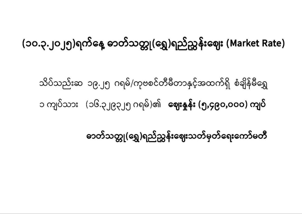 10.3.2025ရက်နေ့ရဲ့ ပြည်တွင်းဓာတ်သတ္တု(ရွှေ )ရည်ညွှန်းစျေး(Market Rate) မှာအောက်ပါအတိုင်းဖြစ်ပါသည်။