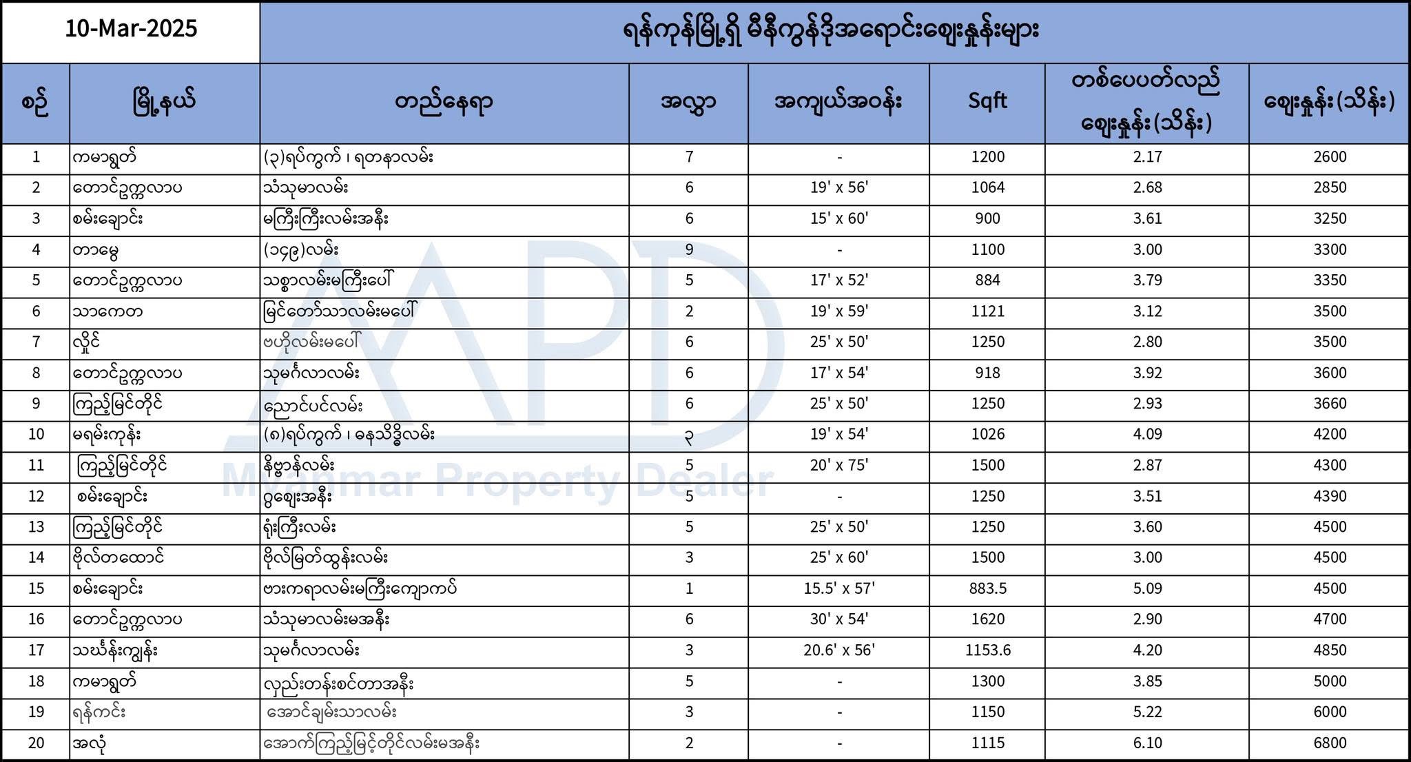 မီနီကွန်ဒိုဝယ်ဖို့စိတ်ဝင်စားနေတဲ့လူကြီးမင်းများအတွက် ရန်ကုန်မြို့နယ်ရှိ အိမ်ခြံမြေဈေးကွက်ပေါ်မှ ကောက်ယူရရှိထားတဲ့ မီနီကွန်ဒိုအရောင်းစျေးနှုန်းများဖော်ပြပေးလိုက်ပြီး လက်ရှိအိမ်ခြံမြေဈေးကွက်ပေါ်မှ ကောက်ယူရရှိထားသည့်စျေးနှုန်းများဖြစ်သည့်အတွက်အချိန်နဲ့အမျှပြောင်းလဲနိုင်ပါသည်။