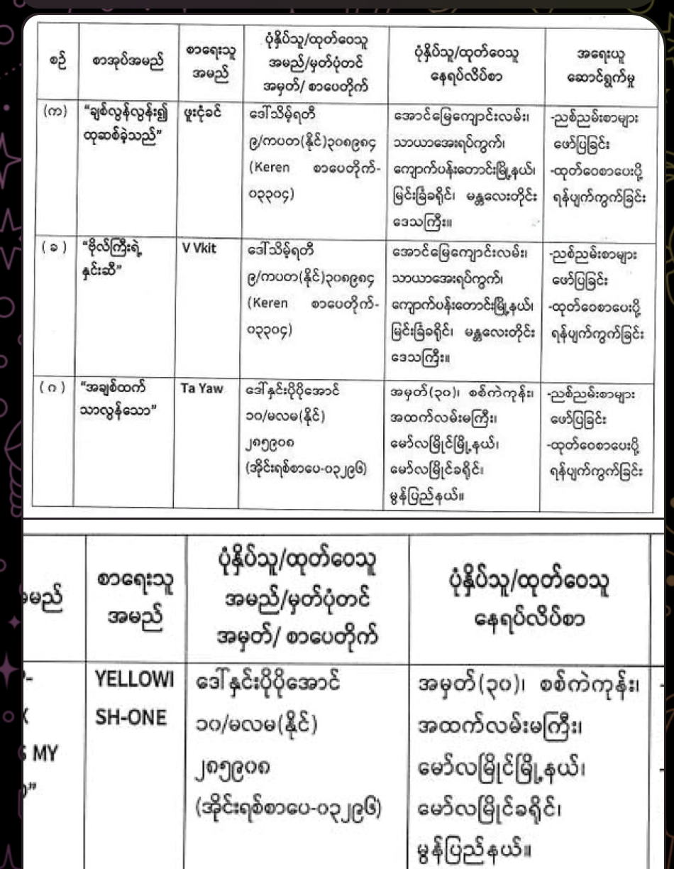 ပြန်ကြားရေးဝန်ကြီးဌာနသည် ၂၀၁၄ ခုနှစ် ပုံနှိပ်ခြင်းနှင့်ထုတ်ဝေခြင်းလုပ်ငန်းဥပဒေ၊ နည်းဥပဒေများနှင့်အညီ ပုံနှိပ်ခြင်းလုပ်ငန်း၊ ထုတ်ဝေခြင်းလုပ်ငန်းများကို ကြီးကြပ်ဆောင်ရွက်လျက်ရှိပါသည်။အရေးယူခံရသည့် ပုံနှိပ်သူနှင့် ထုတ်ဝေသူ (၂) ဦးမှာ ဒေါ်သိမ့်ရတီနှင့် ဒေါ်နှင်းပိုပိုအောင်တို့ဖြစ်ပြီး စာရေးသူများမှာ ဖူးငုံခင်၊ V Vkit၊ Ta Yaw နှင့် Yellow၊ SH-ONE တို့ဖြစ်သည်။ ၎င်းတို့ရေးသားခဲံသည့်စာအုပ်များမှာ ချစ်လွန်း၍ ထုဆစ်ခဲ့သည်၊ ဗိုလ်ကြီးရဲ့နှင်းဆီ၊ အချစ်ထက် သာလွန်သော၊ My Step MOM’SEX BECOMES My Husband တို့ဖြစ်သည်။