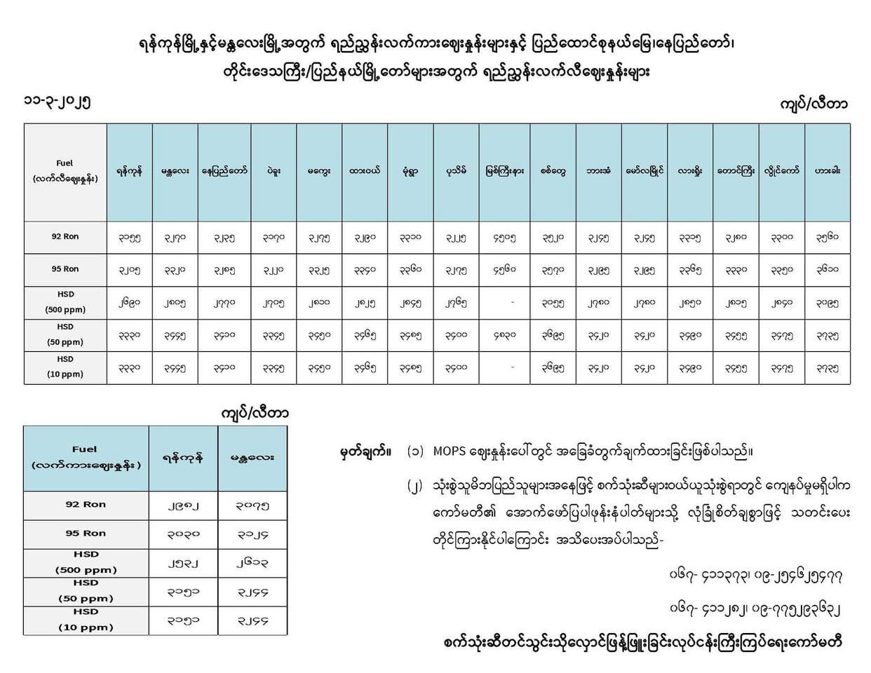 ယနေ့ပြည်တွင်းစက်သုံးဆီဈေးနှုန်းများ