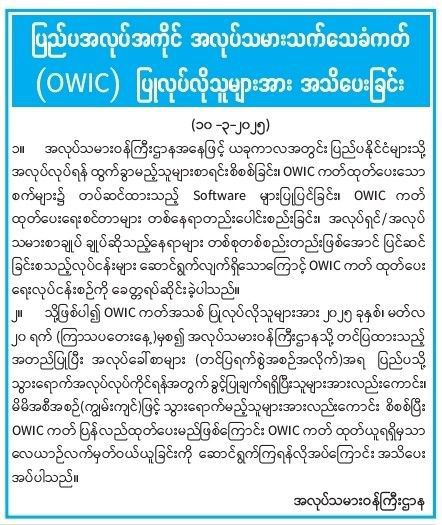 မြန်မာနိုင်ငံမှ ၂၀၂၅ခုနှစ်အတွက် ပြည်ပအလုပ်အကိုင် အလုပ်သမားသက်သေခံကတ် (OWIC) ပြုလုပ်လိုသူများအား အသိပေးခြင်းမှာ အောက်ပါအတိုင်းထုတ်ပြန်ထားခြင်းဖြစ်ပါတယ်။