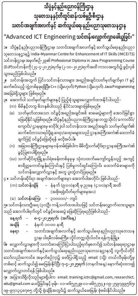 မြန်မာနိုင်ငံရှိ သိပ္ပံနှင့်နည်းပညာဝန်ကြီးဌာန သုတေသနနှင့်တီထွင်ဆန်းသစ်မှုဦးစီးဌာန မှသတင်း အချက်အလက်နှင့် ဆက်သွယ်ရေးနည်းပညာသုတေသနဌာန "Advanced ICT Engineering သင်တန်းလျှောက်လွှာခေါ်ယူမှုမှာအောက်ပါအတိုင်းဖြစ်ပါတယ်။
