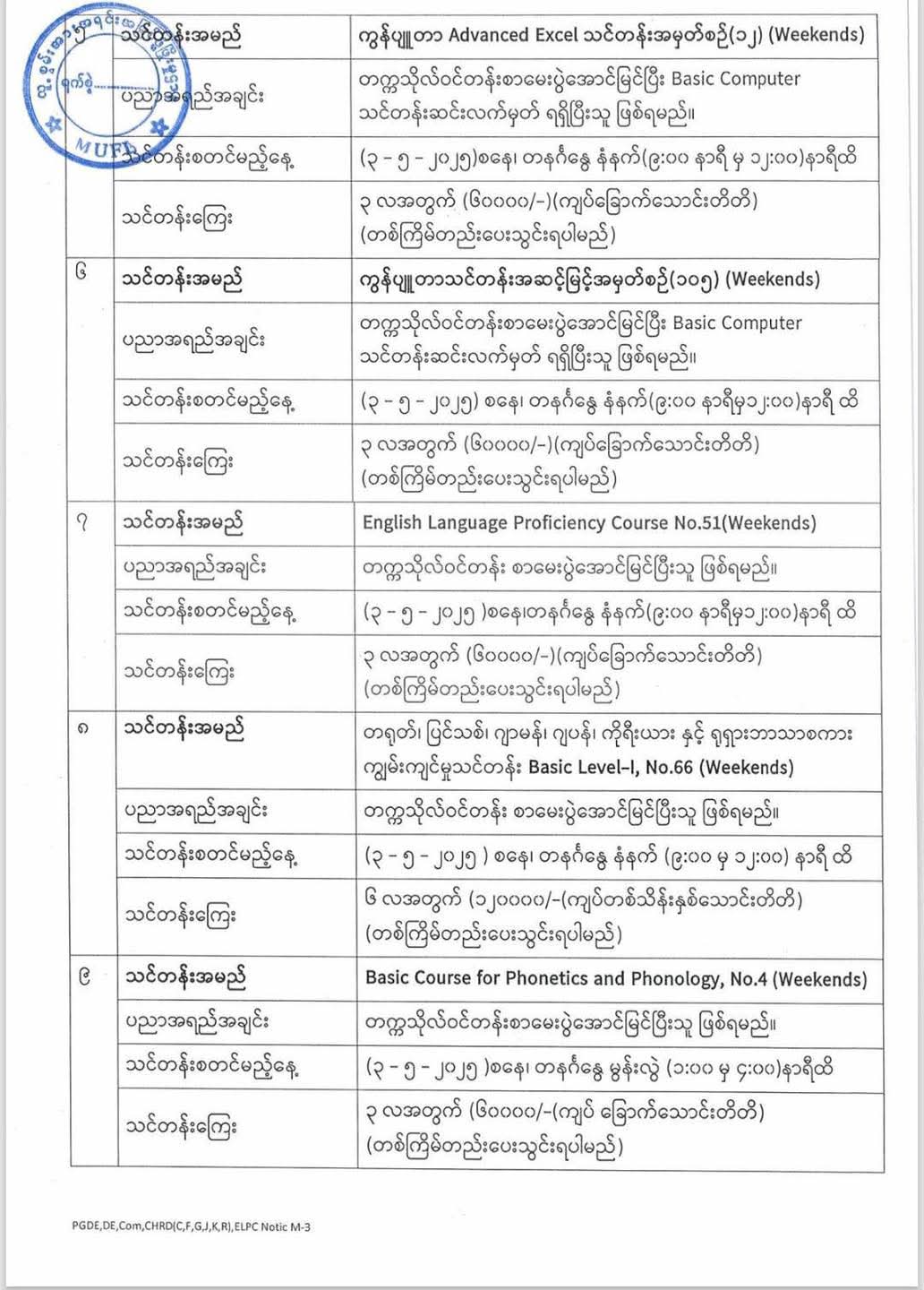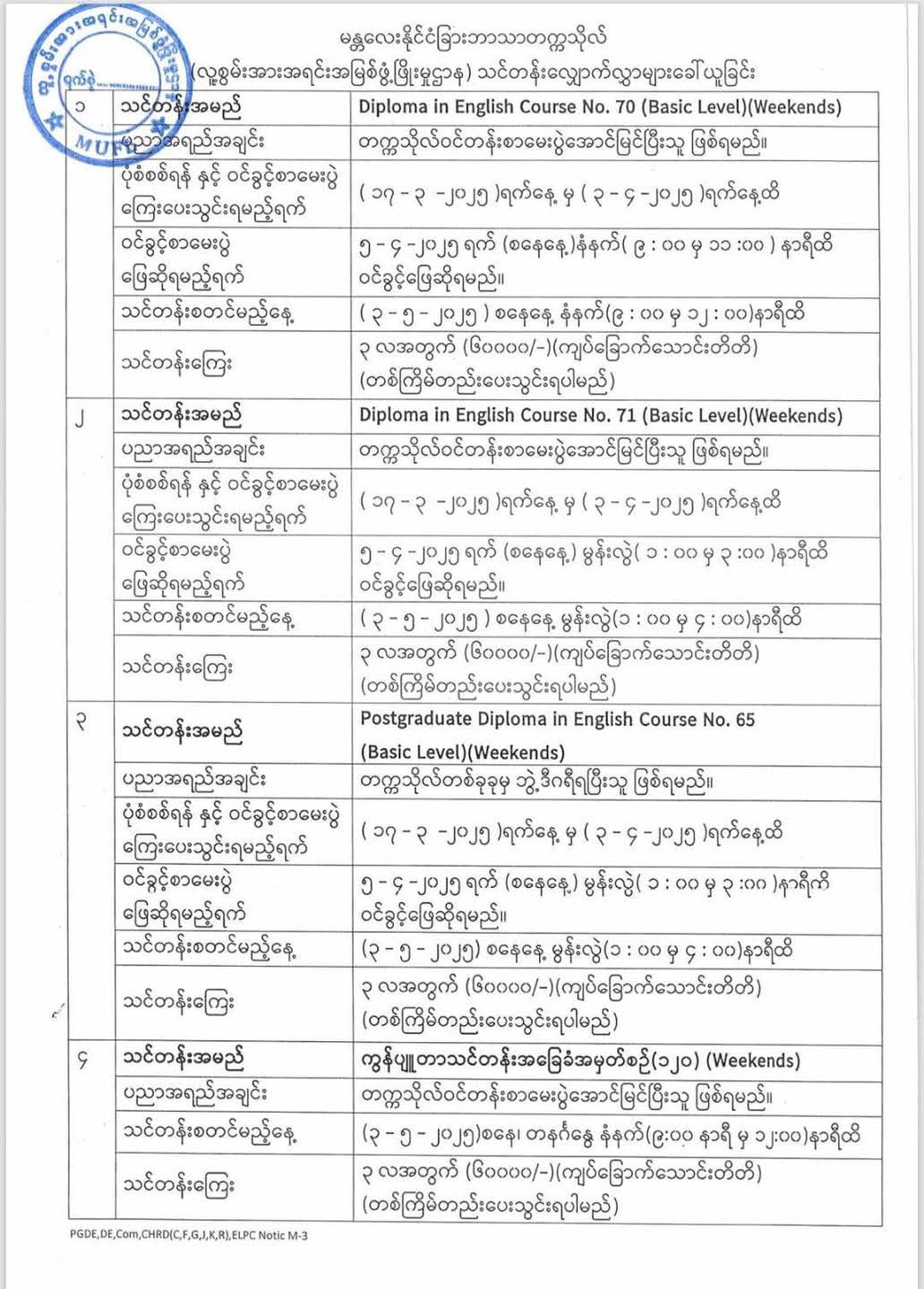 မန္တလေးတိုင်းရှိ နိုင်ငံခြားဘာသာသင်တက္ကသိုလ်မှသင်တန်းလျှောက်လွှာများခေါ်ယူမှုမှာ အောက်ပါအတိုင်းဖြစ်ပါတယ်။
