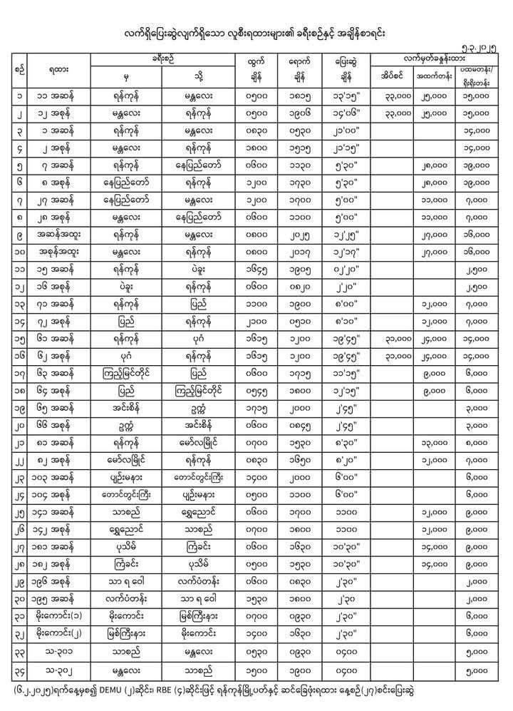 မြန်မာတစ်နိုင်ငံလုံးတွင်မြန်မာ့မီးရထားမှပြေးဆွဲပေးလျက်ရှိသောရထားခရီးစဉ်အစအဆုံး၊ထွက်ချိန်/ရောက်ချိန်နှင့် လက်မှတ်ခနှုန်းထားများကြေညာထားပါသည်။