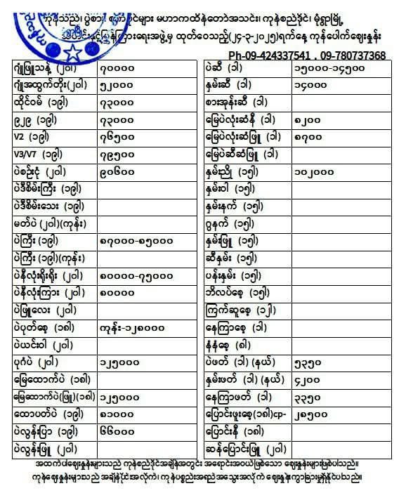 ကုန်သည်၊ ပွဲစား၊ စက်ပိုင်များ မဟာကထိန်တော်အသင်း ကုန်စည်ဒိုင် မုံရွာမြို့ သတင်းနှင့် ပြန်ကြားရေးအဖွဲ့မှ ထုတ်ဝေသည့် ကုန်ပေါက်ဈေးနှုန်းမှာအောက်ပါအတိုင်းဖြစ်ပါသည်။