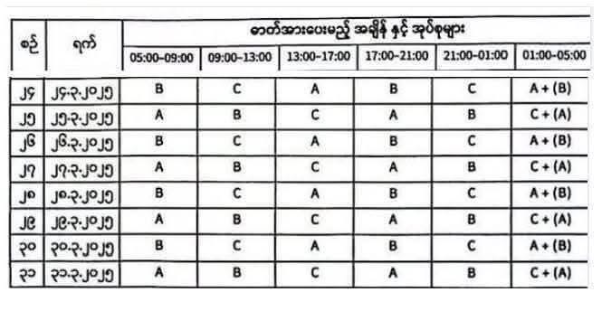 ရန်ကုန်တိုင်းတွင် မတ် ၂၄ ရက်မှစတင်ကာ ၄ နာရီလာ၊ ၈ နာရီပျက် စနစ်ဖြင့် လျှပ်စစ်ဓာတ်အား ဖြန့်ဖြူးမည်ဖြစ်ကြောင်း လျှပ်စစ်ဝန်ကြီးဌာနမှ ထုတ်ပြန်ထားသည်။ ဓာတ်တိုင်အချို့ ပျက်စီးချို့ယွင်းမှုများ၊ နွေရာသီရောက်ရှိပြီး ဓာတ်အားထုတ်လုပ်မှု လျော့နည်းမှုများကြောင့် ဖြစ်သည်ဟု တာဝန်ရှိသူများက ဖော်ပြထားသည်။ ယခင်က ၄ နာရီပျက်၊ ၄ နာရီလာဖြင့် ဖြန့်ဖြူးနေသည့် မြို့နယ်များတွင်လည်း ဓာတ်အားပြတ်တောက်မှုပိုမိုဆိုးရွားလာကြောင်း သိရသည်။