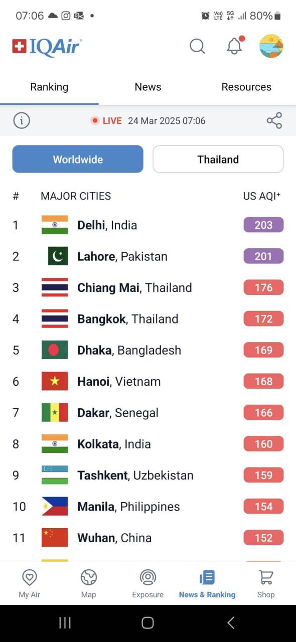 ထိုင်းနိုင်ငံ၊ ချင်းမိုင်နှင့် ဘန်ကောက် နှစ်ခုစလုံးသည် ကမ္ဘာ့လေထုအညစ်ညမ်းဆုံးမြို့ကြီးများအနက် ထိပ်တန်း ၁၀ ခုတွင် မတ်လ ၂၄ ရက် တနင်္လာနေ့ နံနက်တွင် တတိယရက်ဆက်တိုက် ပါဝင်နေကြောင်း သိရသည်။ ထိုင်းနိုင်ငံ၏ နောက်ထပ်မြို့နှစ်ဆယ်သည် ယနေ့တွင်လည်း အနီရောင်ဖြစ်နေကြောင်း သိရသည်။