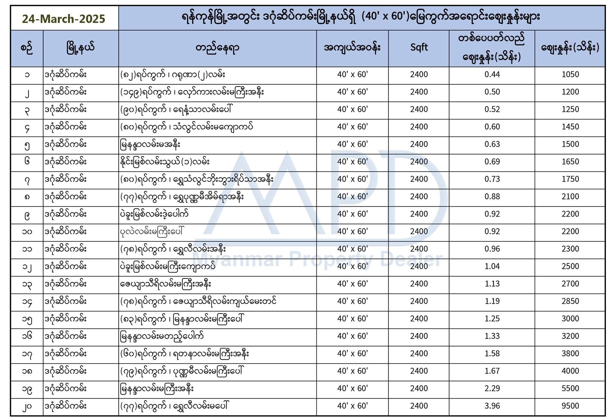 မြေကွက်ဝယ်ဖို့စိတ်ဝင်စားနေတဲ့လူကြီးမင်းများအတွက် ရန်ကုန်မြို့နယ်ရှိ အိမ်ခြံမြေဈေးကွက်ပေါ်မှ ကောက်ယူရရှိထားတဲ့ ဒဂုံဆိပ်ကမ်းမြို့နယ်ရှိ (40' x 60')မြေကွက်အရောင်းစျေးနှုန်းများဖော်ပြပေးလိုက်ပြီးဖော်ပြပေးထားသောဈေးနှုန်းများသည် လက်ရှိအိမ်ခြံမြေဈေးကွက်ပေါ်မှ ကောက်ယူရရှိထားသည့်စျေးနှုန်းများဖြစ်သည့်အတွက်အချိန်နဲ့အမျှပြောင်းလဲနိုင်ပါသည်။