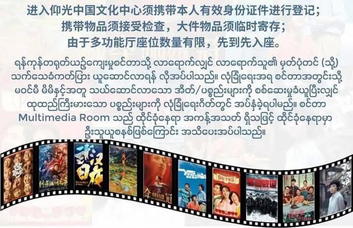 ရန်ကုန်မြို့၊ အလုံမြို့နယ်ရှိ ရန်ကုန်တရုတ်ယဉ်ကျေးမှုစင်တာတွင် လူကြိုက်များသော တရုတ်ရုပ်ရှင်ဇာတ်ကားကောင်းများကို အပတ်စဉ် စနေနေ့တိုင်း ပြသပေးလျက်ရှိကြောင်း သိရသည်။ ရန်ကုန်တရုတ်ယဉ်ကျေးမှုစင်တာ၏ “Weekend ရုပ်ရှင်အစီအစဉ်”အတွက် လူကြိုက်များသော တရုတ်ရုပ်ရှင်ဇာတ်ကားကောင်း (၁၀)ကားကို ရွေးချယ်ထားပြီး အပတ်စဉ် စနေနေ့တိုင်း ဇာတ်ကား (၁)ကားနှုန်းဖြင့် ပြသပေးနေခြင်းဖြစ်ကြောင်း သိရသည်။ဤအစီအစဉ်သည် ရုပ်ရှင်ဝါသနာရှင်များအတွက် ကောင်းမွန်သော အခွင့်အလမ်းတစ်ခုဖြစ်ပြီး တရုတ်ယဉ်ကျေးမှုနှင့် ရုပ်ရှင်အနုပညာကို စိတ်ဝင်စားသူများ အတွက် လေ့လာနိုင်သည့် အခွင့်အရေးတစ်ရပ်လည်း ဖြစ်ကြောင်း သိရသည်။