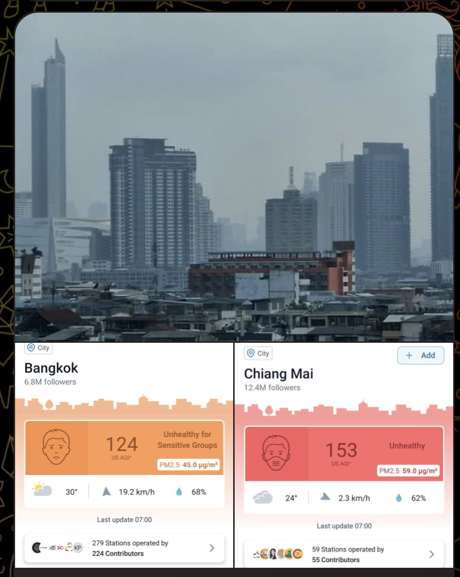 လေးရက်အကြာတွင် ထိုင်းနိုင်ငံ၊ ဘန်ကောက်နှင့် ချင်းမိုင်တို့သည် ကမ္ဘာ့လေထုညစ်ညမ်းမှုအရှိဆုံးမြို့ကြီး 10 စာရင်းတွင် ပါဝင်နေသော်လည်း IQAir အက်ပလီကေးရှင်းအရ ဘန်ကောက်သည် နံပါတ် 17 နှင့် ချင်းမိုင်မြို့ 13 တွင် မတ်လ ၂၆ ရက် ဗုဒ္ဓဟူးနေ့ နံနက်အထိ နံပါတ် 17 တွင် ရှိနေဆဲဖြစ်သည်။ Khon Kaen နှင့် Udon Thani ဦးဆောင်သော နောက်ထပ်မြို့တစ်ဒါဇင်သည် ကျန်းမာရေးနှင့် မညီညွတ်သော လေထုနှင့် ရင်ဆိုင်နေရသည်။