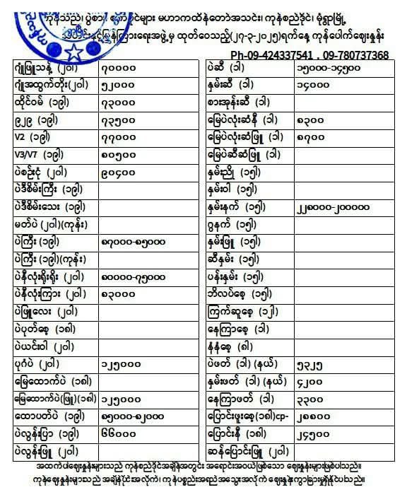 ကုန်သည်၊ ပွဲစား၊ စက်ပိုင်များ မဟာကထိန်တော်အသင်း ကုန်စည်ဒိုင် မုံရွာမြို့ သတင်းနှင့် ပြန်ကြားရေးအဖွဲ့မှ ထုတ်ဝေသည့် ကုန်ပေါက်ဈေးနှုန်းမှာ အောက်ပါအတိုင်းဖြစ်ပါသည်။