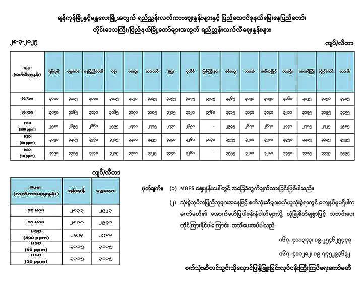 ❝စက်သုံးဆီ တင်သွင်းသိုလောင်ဖြန့်ဖြူးခြင်းလုပ်ငန်း ကြီးကြပ်ရေးကော်မတီက ယနေ့ ၂၀၂၅ ခုနှစ်၊ မတ်လ ( ၂၈ ) ရက်နေ့မှာ ထုတ်ပြန်တဲ့ ရန်ကုန်မြို့နဲ့ မန္တလေးမြို့များအတွက် စက်သုံးဆီ ရည်ညွှန်းလက်ကားဈေးနှုန်းများနဲ့ ပြည်ထောင်စုနယ်မြေ နေပြည်တော်၊ တိုင်းဒေသကြီး/ပြည်နယ် မြို့တော်များအတွက် ရည်ညွှန်းလက်လီဈေးနှုန်းများဖြစ်ပါတယ်။❞