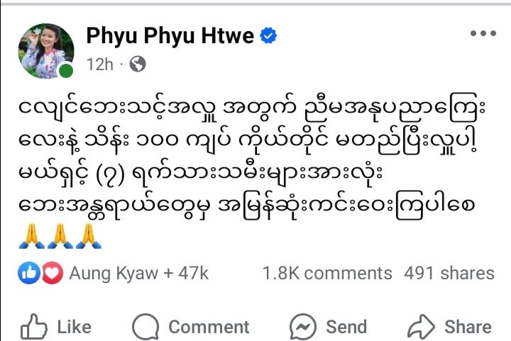 မြန်မာ့ငလျင်ဘေးအတွက် အနုပညာရှင်၊TikTok Celeဖြူဖြူထွေးမှ သိန်း ၁၀၀ကျပ်ကို စတင်မတည်လှူဒါန်းပေးသွားမည်ဟုသိရပါတယ်။အဆိုပါအကြောင်းရာကို သူမရဲ့fb accမှအသိပေးကြေညာထားခြင်းဖြစ်ပါတယ်။