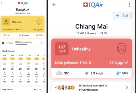 ထိုင်းနိုင်ငံ၊ ချင်းမိုင်သည် မတ်လ ၃၁ ရက် တနင်္လာနေ့ နံနက်တွင် ကမ္ဘာ့လေထုညစ်ညမ်းမှုအရှိဆုံးမြို့များအနက် နံပါတ် ၄ တွင်ရှိပြီး ဘန်ကောက်သည် နံပါတ် ၂၂ ဖြစ်သည်ဟု IQAir အက်ပ်၏အဆိုအရ သိရသည်။ ချင်းမိုင်သည် ယခု တတိယရက်ဆက်တိုက် ထိပ်ဆုံး 5 နေရာတွင် ရှိနေသည်။