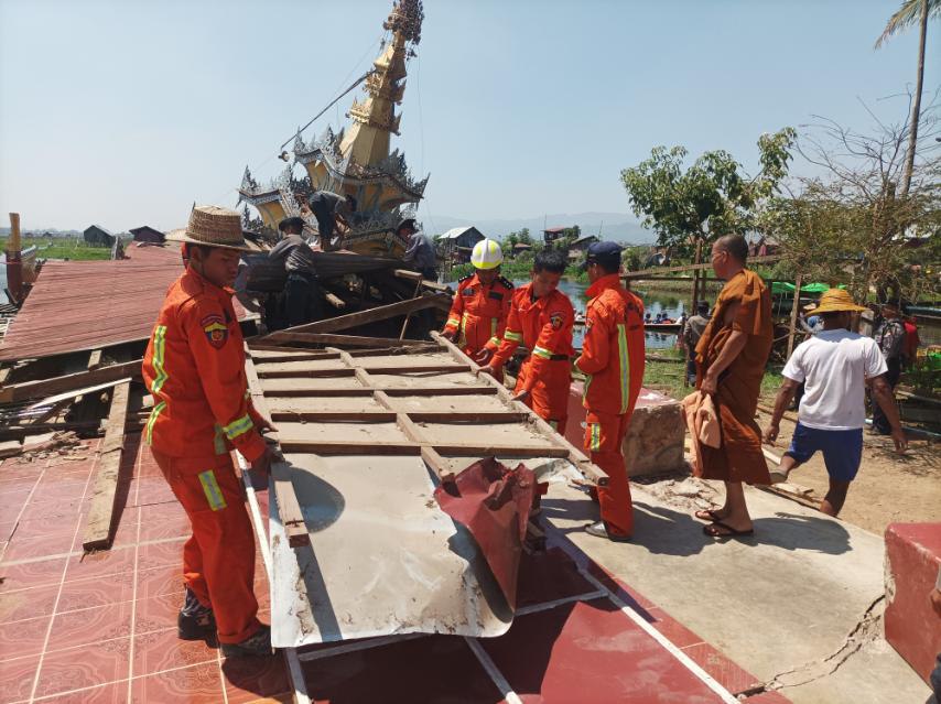 ရှမ်းပြည်နယ်၊ ကလောမြို့နယ်တွင် ငလျင်လှုပ်ခတ်မှုကြောင့် ပြိုကျပျက်စီးမှုများအား ရှမ်းပြည်နယ်ရှာဖွေကယ်ဆယ်ရေးတပ်ဖွဲ့ဝင်များလုပ်ဆောင်နေ