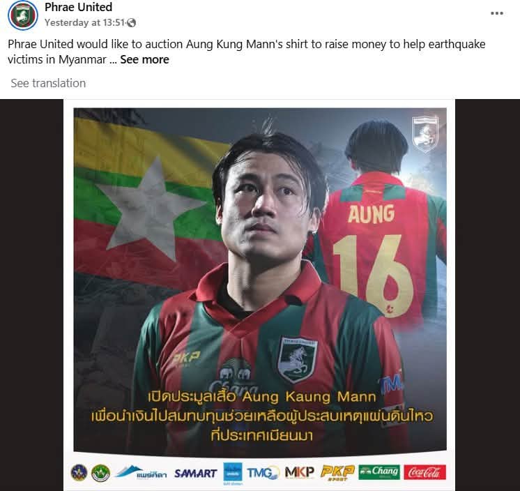 မြန်မာ့လက်ရွေးစင်တိုက်စစ်မှူး အောင်ကောင်းမာန် ကစားနေတဲ့ ထိုင်းလိဂ် ၂ ကလပ် ဖာရေး ယူနိုက်တက်အသင်းဟာ မြန်မာနိုင်ငံရဲ့ ငလျင်ဘေးဒဏ်သင့် ပြည်သူတွေအတွက်လှူဒါန်းနိုင်ဖို့ အောင်ကောင်းမာန်ရဲ့ ဂျာစီကို လေလံအစီအစဉ် ပြုလုပ်နေပါတယ်။ အောင်ကောင်းမာန်ရဲ့ ဂျာစီကို ထိုင်းငွေ ၉၉ ဘတ်နဲ့ စတင် လေလံခေါ်ခဲ့တာဖြစ်ပြီး လာမယ့် ဧပြီ ၂ ရက်မှာ လေလံပိတ်သိမ်းမှာဖြစ်ပါတယ်။ လက်ရှိအချိန်မှာတော့ ၄၉၉၉ ဘတ် အထိ ပေးထားသူရှိနေပြီလို့ သိရပါတယ်။ ဘယ်လောက်နဲ့ လေလံပြီးဆုံးမလဲဆိုတာ စောင့်ကြည့်ရမှာလည်းဖြစ်ပါတယ်။