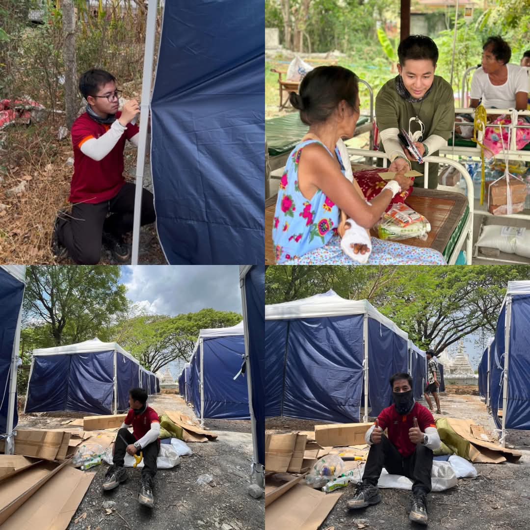 သရုပ်ဆောင် အိစိကွေးကတော့ ယာယီတဲ ၁၀၀ ထိုးပေးနေတာမှာ ၂၀ ရာခိုင်နှုန်းလောက်ပြီးစီးနေပြီဖြစ်ကာ လက်ရှိ ငလျင်ဘေးဒဏ်ကြောင့် တိုက်အိမ်တွေမှာ မနေရဲတော့ဘဲ ၊ အိုးအိမ်ပျက်ဆီးသွားသူတွေဟာ ကျုံးမြောက်ဘက် ဇရပ်တန်းမှာ ယာယီ နေနေကြတာလည်းဖြစ်ပါတယ်။ အဆိုပါ ဒုက္ခဘေးသင့်နေသူတွေကို မန္တလေးတောင်ခြေက ကုသိုလ်တော်ဘုရား အနောက်ဘက်ခြမ်းမှာ ယာယီတဲ ၁၀၀ လုံး ထိုးပေးနေခြင်းလည်းဖြစ်ပါတယ်။