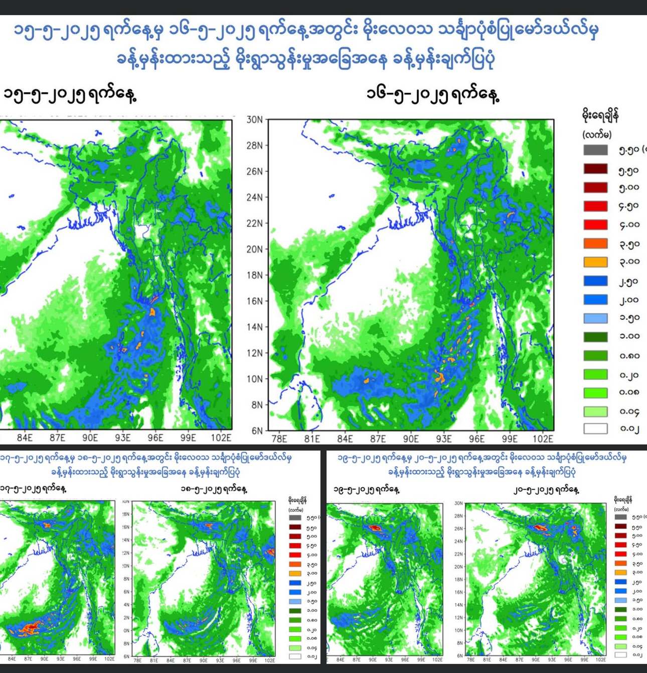 ၂၀၂၅ ခုနှစ်၊ မေလ ၁၄ ရက်နေ့၊ မြန်မာစံတော်ချိန် ၁၉:၀၀ နာရီအချိန် ထုတ်ပြန်ချက်အရ ယနေ့ညမှ ၁၇-၅-၂၀၂၅ ရက်နေ့ အတွင်း နေပြည်တော်၊ ရန်ကုန်တိုင်းဒေသကြီး၊ မန္တလေးတိုင်းဒေသကြီး၊ ပဲခူး တိုင်းဒေသကြီး၊ မကွေးတိုင်းဒေသကြီး၊ စစ်ကိုင်းတိုင်းဒေသကြီး၊ ဧရာဝတီတိုင်းဒေသကြီး၊ တနင်္သာရီတိုင်းဒေသကြီး၊ ကချင်ပြည်နယ်၊ ကယားပြည်နယ်၊ ကရင်ပြည်နယ်၊ ချင်းပြည်နယ်၊ မွန်ပြည်နယ်၊ ရခိုင်ပြည်နယ်နှင့် ရှမ်းပြည်နယ်တို့တွင် နေရာစိပ်စိပ်မှ နေရာအနှံ့အပြား မိုးထစ်ချုန်း ရွာပြီး၊ ၁၈-၅-၂၀၂၅ ရက်နေ့မှ ၂၀-၅-၂၀၂၅ ရက်နေ့အတွင်း နေပြည်တော်၊ ရန်ကုန်တိုင်းဒေသကြီး၊ မန္တလေးတိုင်းဒေသကြီး၊ မကွေး တိုင်းဒေသကြီး၊ စစ်ကိုင်းတိုင်းဒေသကြီး၊ ဧရာဝတီတိုင်းဒေသကြီး၊ ကချင်ပြည်နယ်၊ ချင်းပြည်နယ်၊ ရခိုင်ပြည်နယ်နှင့် ရှမ်းပြည်နယ်တို့တွင် နေရာစိပ်စိပ်မှ နေရာအနှံ့အပြားနှင့် ပဲခူးတိုင်းဒေသကြီး၊ တနင်္သာရီတိုင်းဒေသကြီး၊ ကယားပြည်နယ်၊ ကရင်ပြည်နယ်နှင့် မွန်ပြည်နယ်တို့တွင် နေရာကျဲကျဲ မိုးထစ်ချုန်းရွာပြီး၊ အချို့ဒေသများတွင် နေရာကွက်၍ မိုးကြီးနိုင်ပါသည်။သို့ဖြစ်ပါ၍ မိုးသည်းထန်စွာရွာသွန်းခြင်းနှင့်အတူ လေပြင်းတိုက်ခတ်ခြင်း၊ မိုးထစ်ချုန်းခြင်း၊ မိုးကြိုးပစ်ခြင်း၊ လျှပ်စီးလက်ခြင်း၊ မိုးသီးကြွေခြင်း၊ လျှပ်တစ်ပြက်ရေကြီးခြင်းနှင့် မြေပြိုခြင်းစသည့် သဘာဝဘေးအန္တရာယ်များ ဖြစ်ပေါ်နိုင်ပါသဖြင့် အဆိုပါဒေသများရှိ ကုန်းမြင့်ဒေသအနီးတွင် နေထိုင် ကြသူများအနေဖြင့် မြေပြိုမှုအန္တရာယ်၊ မြစ်ငယ်၊ ချောင်းငယ်များအနီးတွင် နေထိုင်ကြသူများအနေဖြင့် ရေကြီး၊ ရေလျှံမှုများကို ကြိုတင်သတိပြုရှောင်ရှားနိုင်ပါရန်နှင့် ပြည်တွင်းရေကြောင်းသွားလာရေးနှင့် လေကြောင်းပျံသန်းရေးအနေဖြင့်လည်း ကြိုတင်သတိပြုနိုင်ပါရန် သတိပေးနှိုးဆော်အပ်ပါသည်။