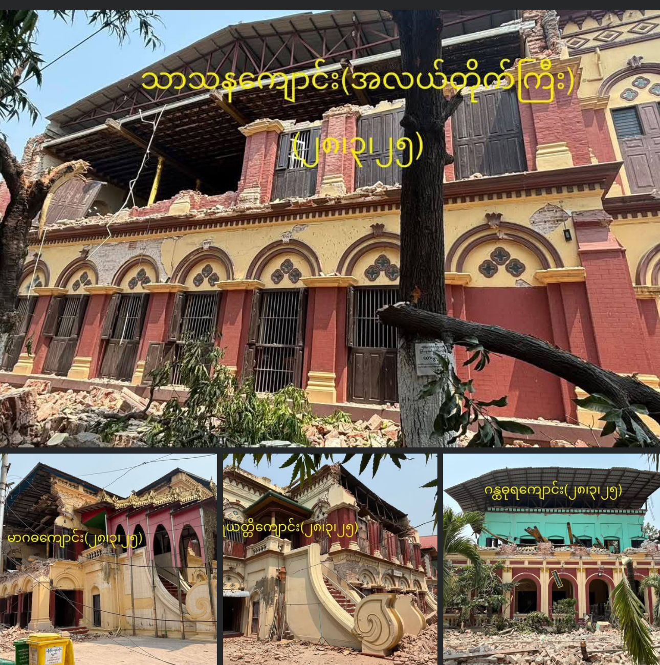 မန္တလေးမြို့၊ မဟာအောင်မြေမြို့နယ်၊ မစိုးရိမ်တိုက်အတွင်း ငလျင်ကြီးကြောင့် ပြိုကျပျက်စီးခဲ့သည့် နာရီစင်ကြီးနှင့်အတူကျောင်းတိုက်(၁၂)ကျောင်းတွင် ကျောင်း(၁၀)ကျောင်းအတွက် အလှူရှင်များ အသီးသီးပေါ်ထွက်ပြီးဖြစ်ကြောင်း ယနေ့ မေ၁၄ရက်နေ့အထိ စာရင်းများအရ သိရသည်။အလှူရှင်မပေါ်ပေါက်သေးသော ကျောင်းတို့မှာ မာဂဓနယူပဒေသကျောင်းနှင့် ပိဋကနယူပဒေသကျောင်းတို့ဖြစ်ပြီး မာဂဓနယူပဒေသကျောင်းကိုလည်း အသစ် ပြန်လည်ဆောက်လုပ်နိုင်ရန် ပြင်ဦးလွင် ဖားအောက်တောရဆရာတော်ကြီးအမှူးပြုသော တပည့် ဒါယကာ, ဒါယိကာမအပေါင်းက မ,တည် လှူဒါန်းမည်ဖြစ်သည်။အလှူရှင်မပေါ်သည့်ကျောင်းကို ငလျင်ဘေးသင့် မစိုးရိမ်ကျောင်းတိုက်ကြီး ပြန်လည်ထူထောင်ရေးအတွက် လှူဒါန်းထားသော နဝကမ္မဝတ္ထုငွေတို့ဖြင့် အများကောင်းမှုအဖြစ် အသစ်ပြန်လည်ဆောက်လုပ်လှူဒါန်းရန် ကနဦး သဘောတူညီထားကြသည်။