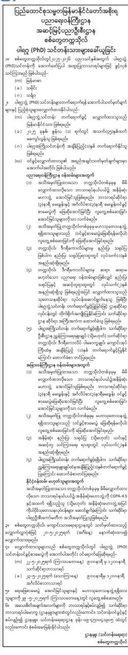 စစ်တွေတက္ကသိုလ်ပါရဂူ (PHD) သင်တန်းသားများခေါ်ယူချက်မှာ အောက်ပါအတိုင်းဖြစ်ပါသည်။