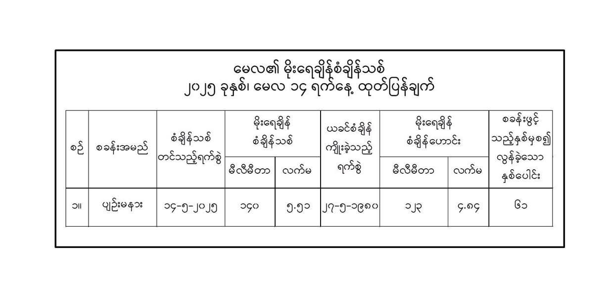 ၂၀၂၅ ခုနှစ်၊ မေလ ၁၄ ရက်နေ့ မိုးလေဝသနှင့်ဇလဗေဒညွှန်ကြားမှုဦးစီးဌာနမှ ထုတ်ပြန်သည့် မေလ၏ မိုးရေချိန်စံချိန်သစ်မှာ အောက်ပါအတိုင်းဖြစ်ပါသည်။