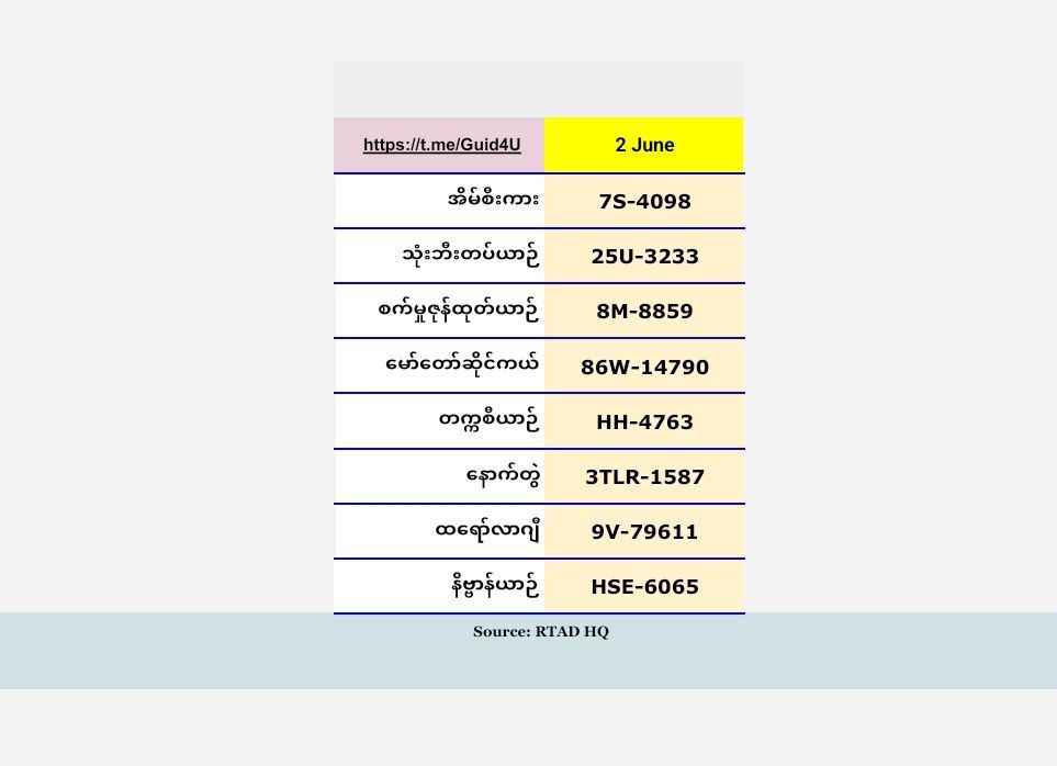 ပြည်တွင်းရှိ ကညနမှ ထုတ်ပြန်သော နောက်ဆုံးရောက်ရှိ မော်တော်ယာဉ် နံပါတ်များမှာ အောက်ပါအတိုင်းဖြစ်ပါတယ်။အဆိုပါစာရင်းမှာ ဇွန်လ၂ရက်နေ့ထိရောက်ရှိစာရင်းလည်းဖြစ်ပါတယ်။