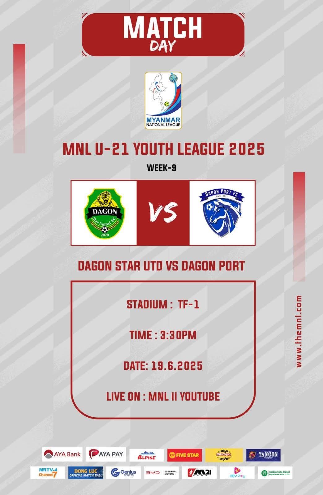 MNL (U-21) Youth League 2025 အမှတ်ပေးဘောလုံးပြိုင်ပွဲ (Week-9) ပွဲစဉ် တစ်ပွဲအဖြစ် Dagon Star Utdအသင်း နှင့် Dagon Port အသင်းတို့ ယနေ့ညနေ ၃:၃၀ နာရီတွင် TF-1 ကွင်း၌ ယှဉ်ပြိုင်ကစားသွားမှာလည်းဖြစ်သည်။
