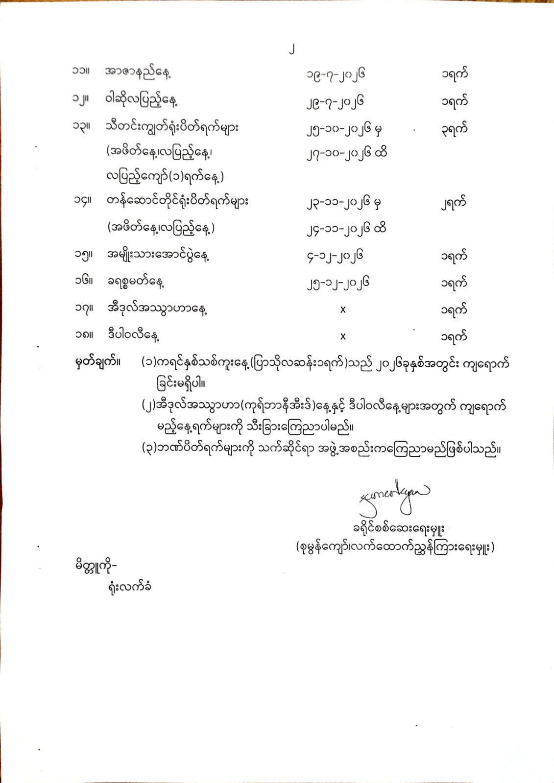 ၂၀၂၆ ခုနှစ်အတွက် အများပြည်သူရုံးပိတ်ရက်များ တရားဝင်ထုတ်ပြန်မှုမှာ-ထူးခြားတာက အစားထိုးပိတ်ရက်တွေတစ်ခါတည်းထည့်ထားလိုက်သလိုဖြစ်ကာပြည်ထောင်စုနေ့ ၂ ရက် ဖြစ်သွားပြီး တရုတ်နှစ်သစ်ကူးလည်း (၂) ရက်ဖြစ်သွားသလိုပိတ်ရက်နဲ့ကပ်သွားလို့ တစ်ဆက်တည်းဖြစ်အောင်လို့ယူဆရပါတယ်။(၂) လပိုင်းမှ (၁၂,၂၃) ပြည်ထောင်စုေန့ပိတ်ရက်